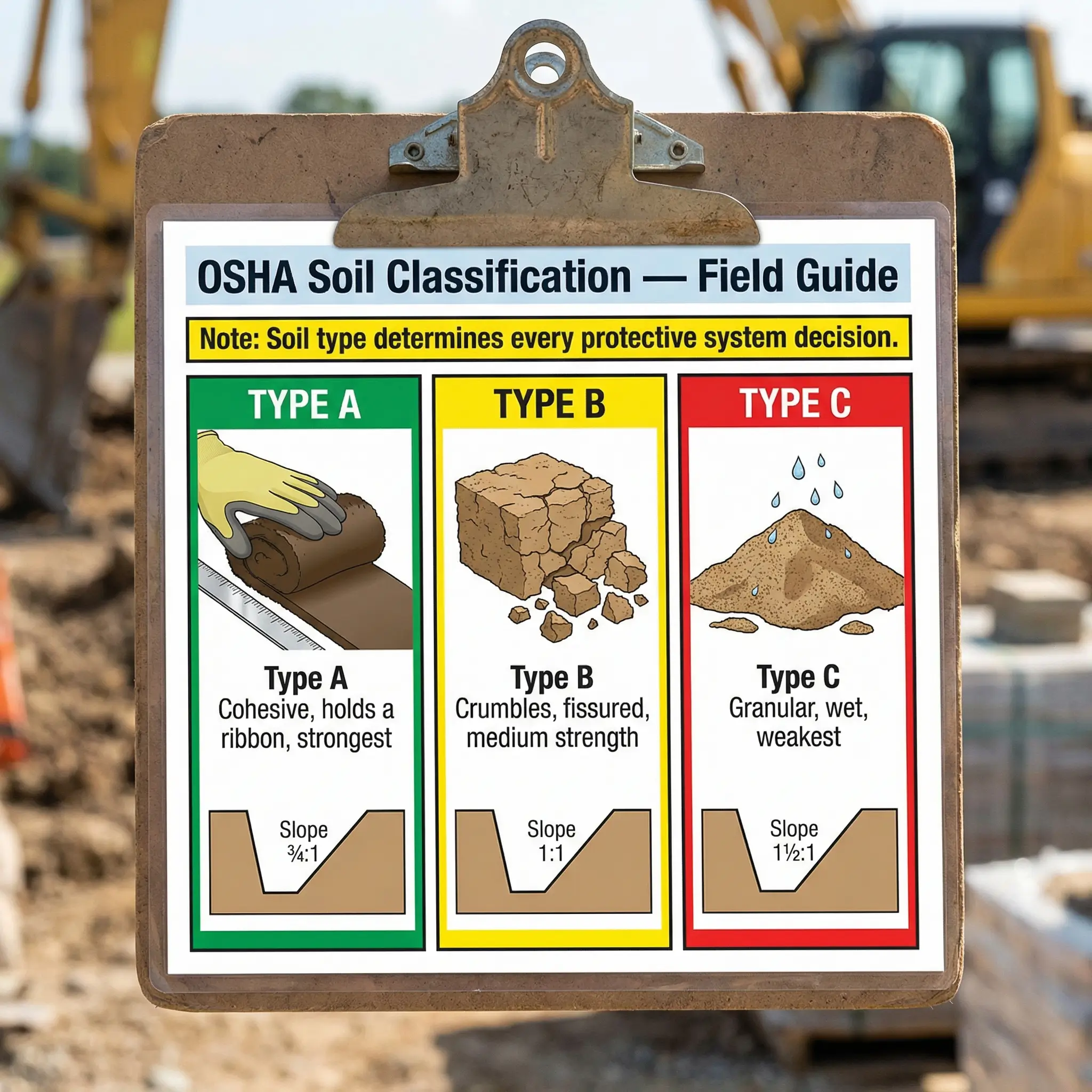 | Type A | Cohesive soils — clay, silty clay, hardpan | 1.5 tsf or greater | ¾:1 (53°) | Holds a vertical face temporarily; can be hand-molded into a ribbon without crumbling |