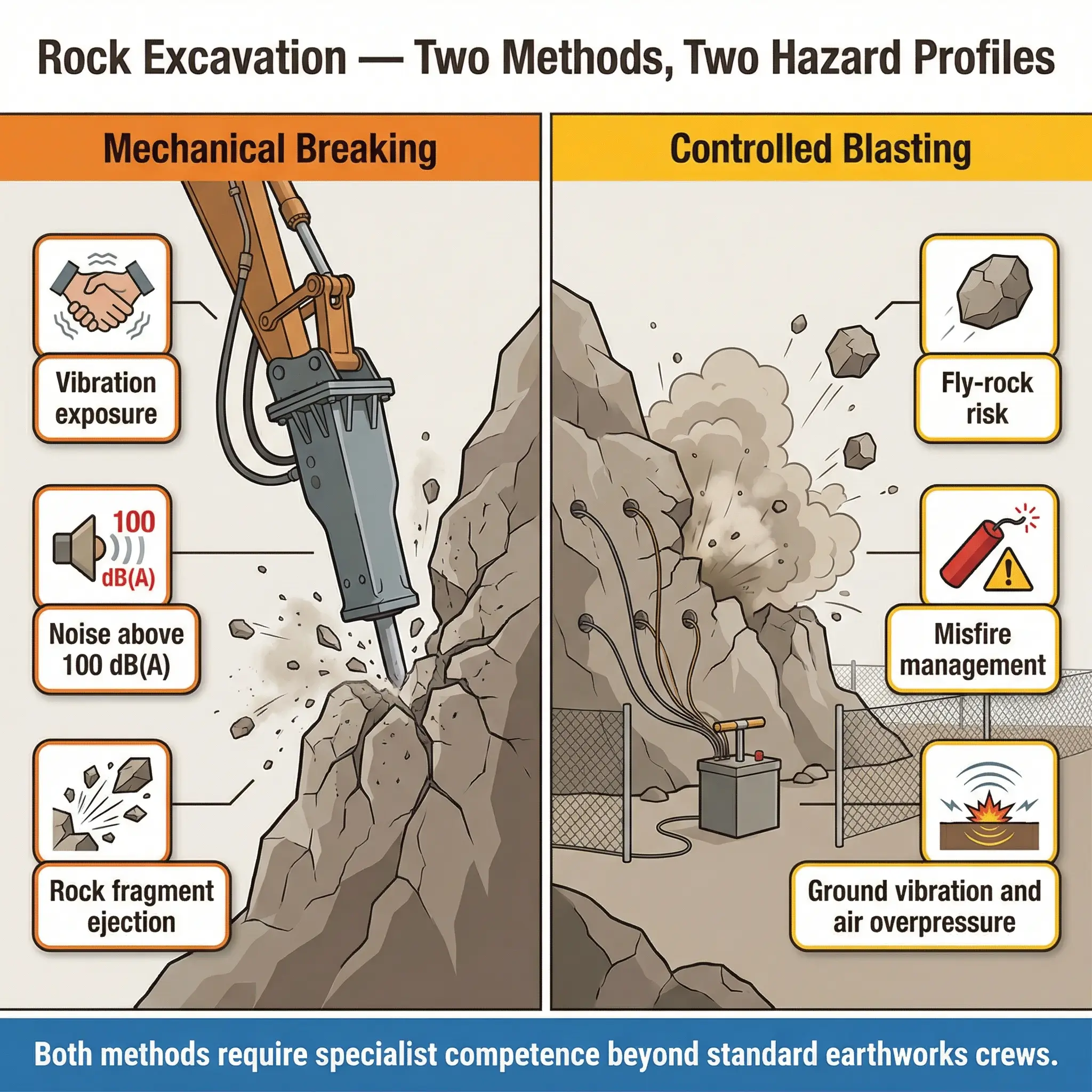 - Equipment selection and exclusion zones: Rock excavation using hydraulic breakers or controlled blasting demands exclusion zones, vibration monitoring, and fly-rock protection that earth excavation does not.