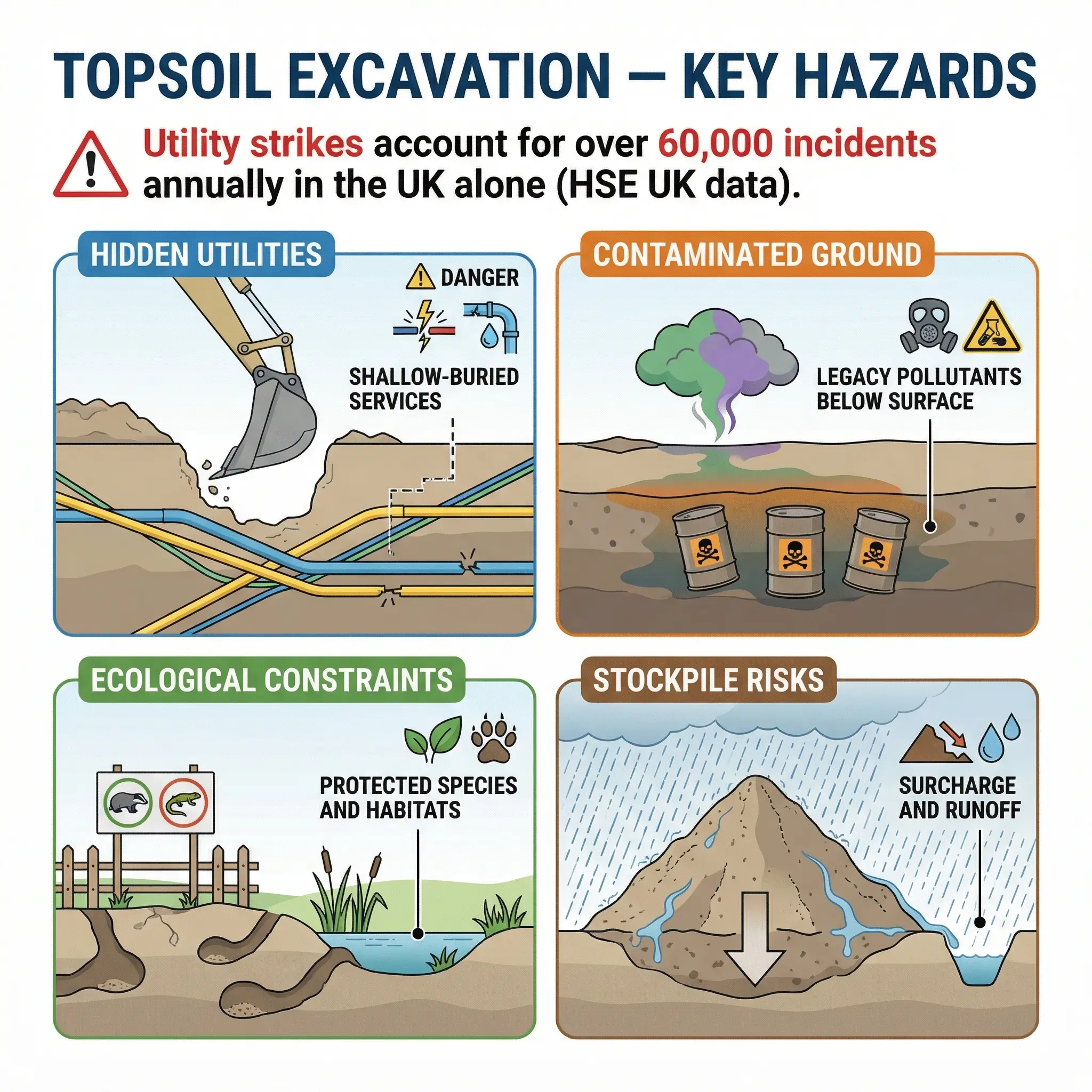 I’ve seen topsoil strips treated as non-hazardous because the excavation depth is shallow. That assumption has been behind some of the worst utility strike incidents I’ve investigated. The following hazards are specific to topsoil excavation and must be addressed before work begins: