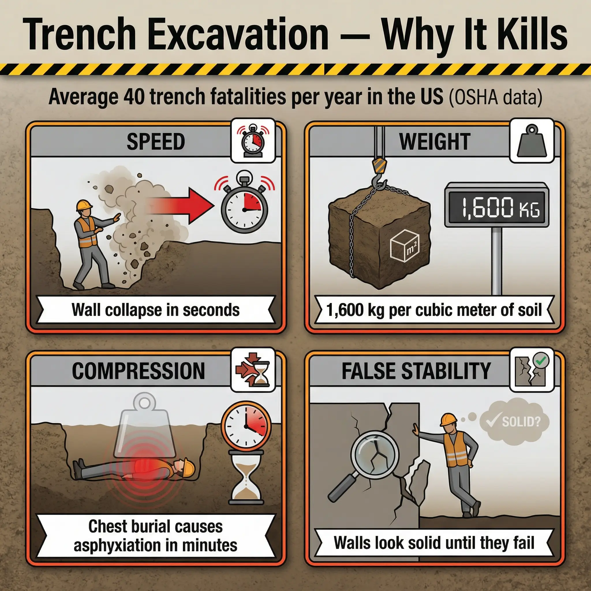- Speed of collapse: A cubic meter of soil weighs approximately 1,600 kg (3,500 lbs). A trench wall failure buries a worker in seconds — there is no time to react, climb, or be pulled out.