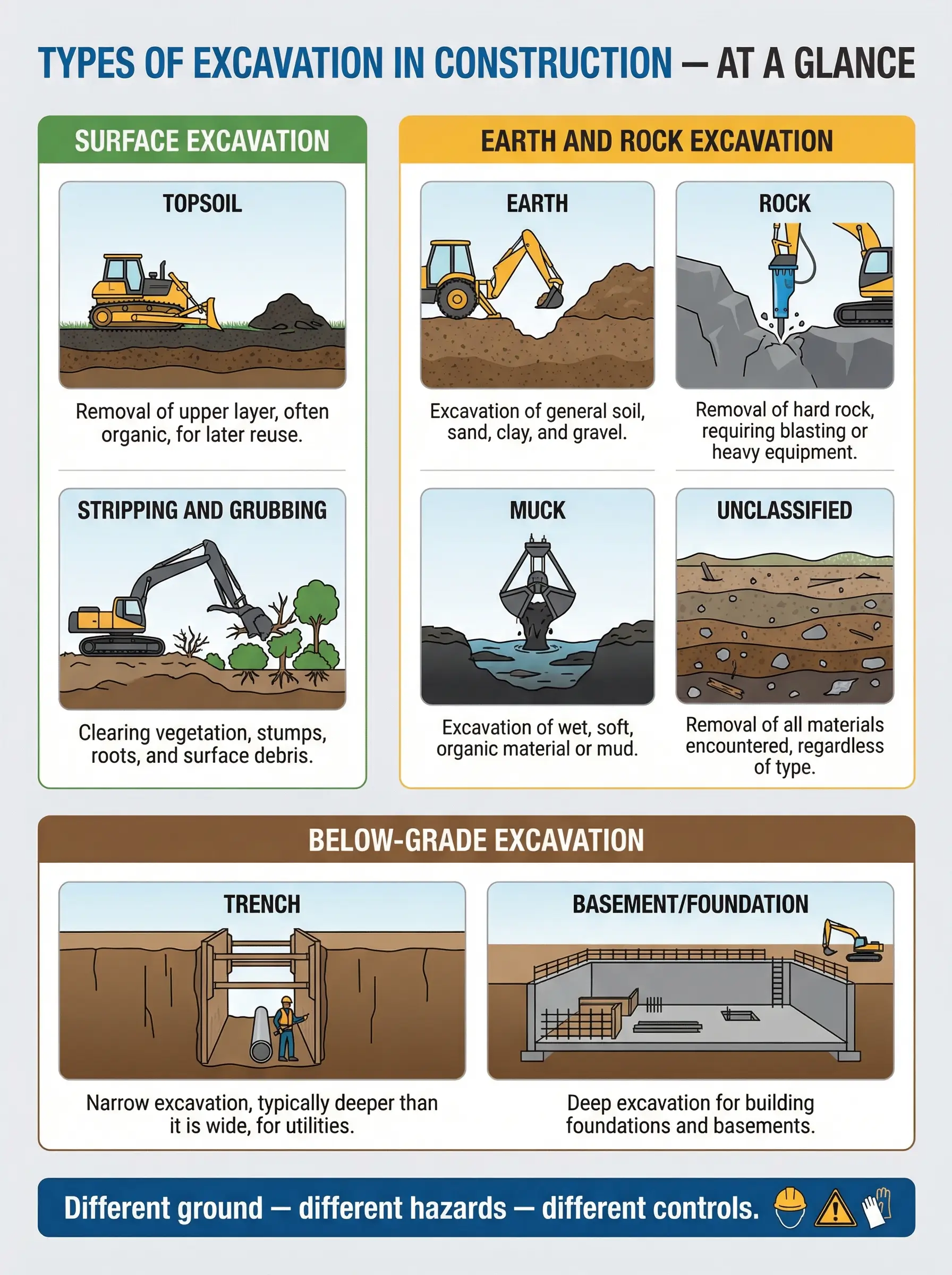 - Matching the method to the ground conditions is a safety decision, not just an engineering one: Choosing the wrong excavation type for the soil classification, water table, or proximity to existing structures directly increases collapse, utility strike, and flooding risk.