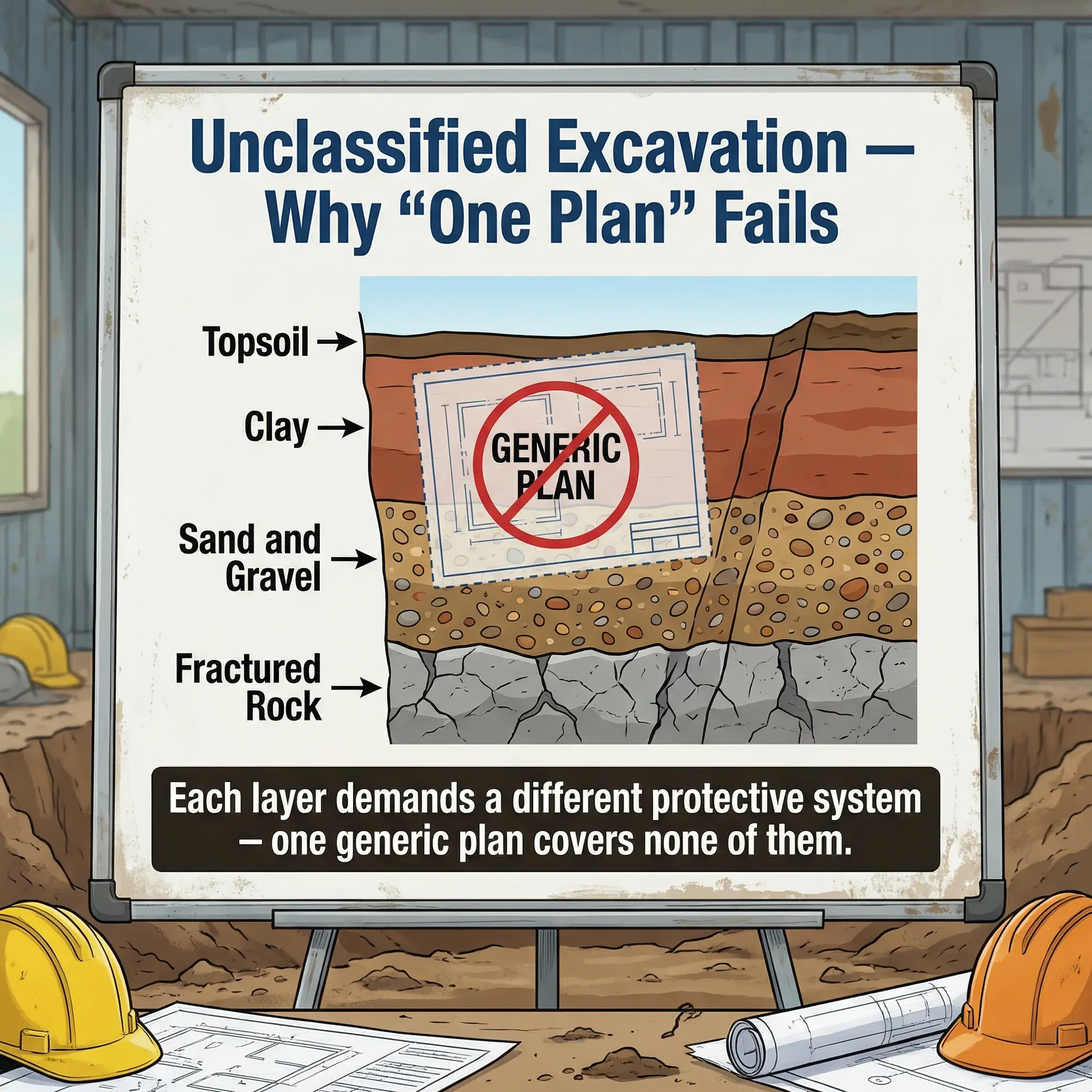 The problem with unclassified excavation is that it encourages a single method statement for multiple material types. I’ve audited projects where the excavation was contractually “unclassified,” and the safety plan reflected that ambiguity — one generic risk assessment, one set of controls, one protective system specification — applied uniformly to conditions that ranged from soft alluvial silt to fractured limestone within the same excavation footprint.