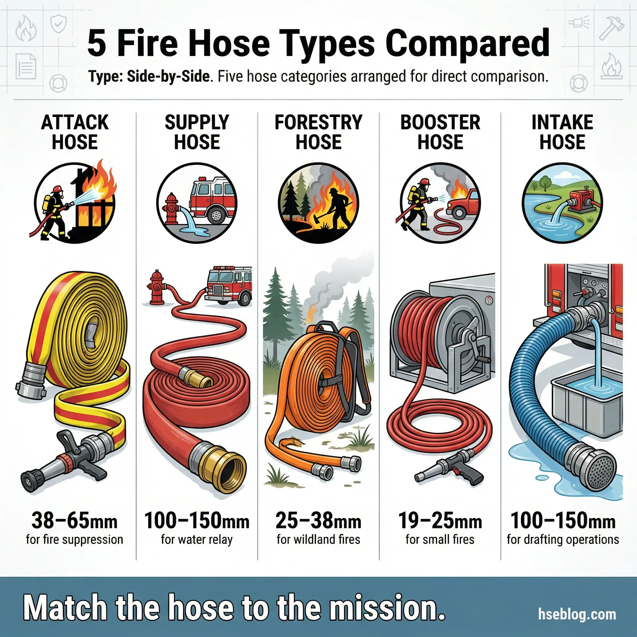- Five main fire hose types exist: attack hose, supply hose, forestry hose, booster hose, and intake hose — each built for a specific role.