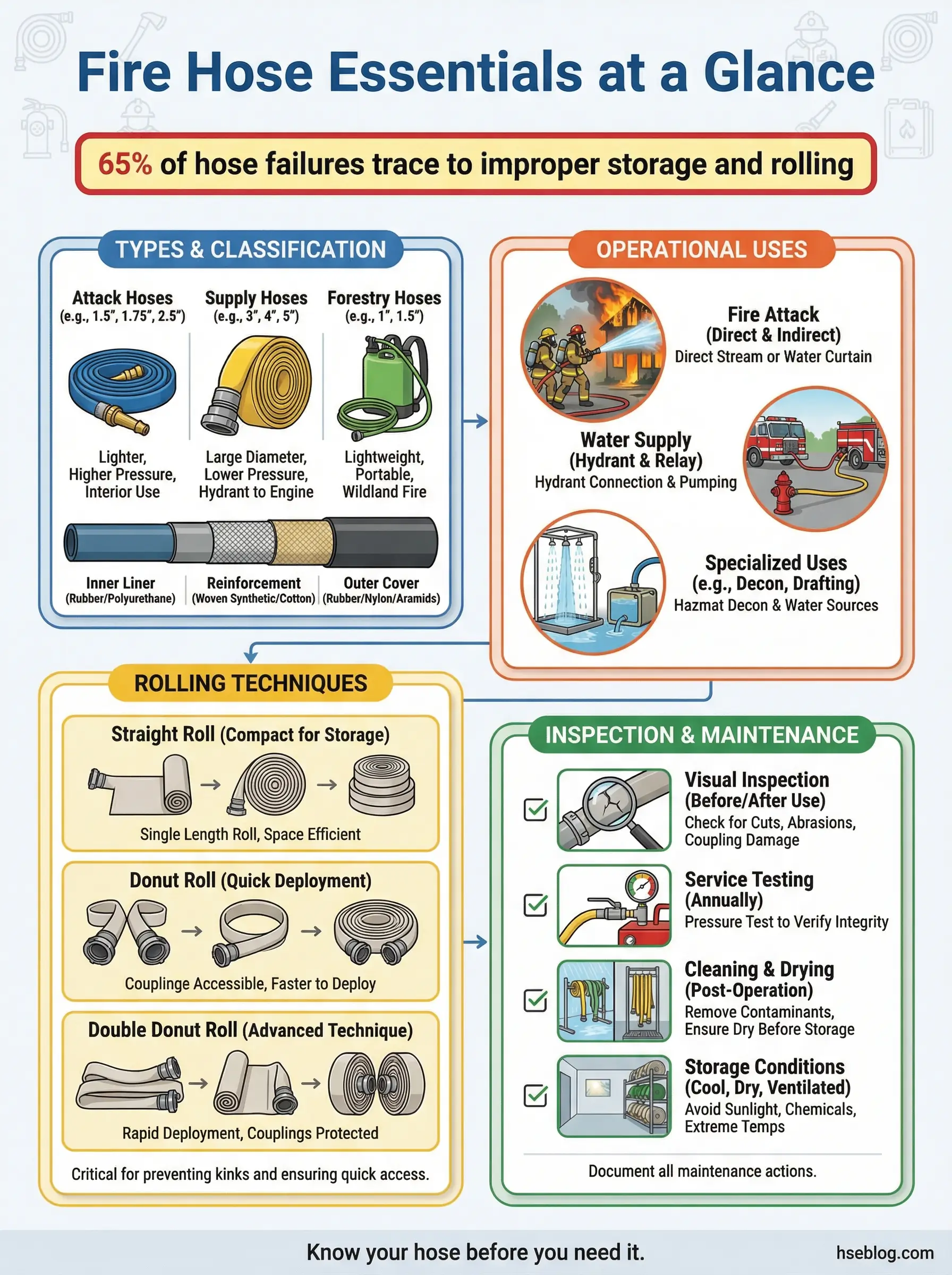 The fire hose connects your water supply to the fire. Every link in that chain — type selection, coupling compatibility, jacket condition, liner integrity, rolling discipline — must hold. When one link fails during an active fire, people get hurt. No shortcut in storage or maintenance is worth that outcome.