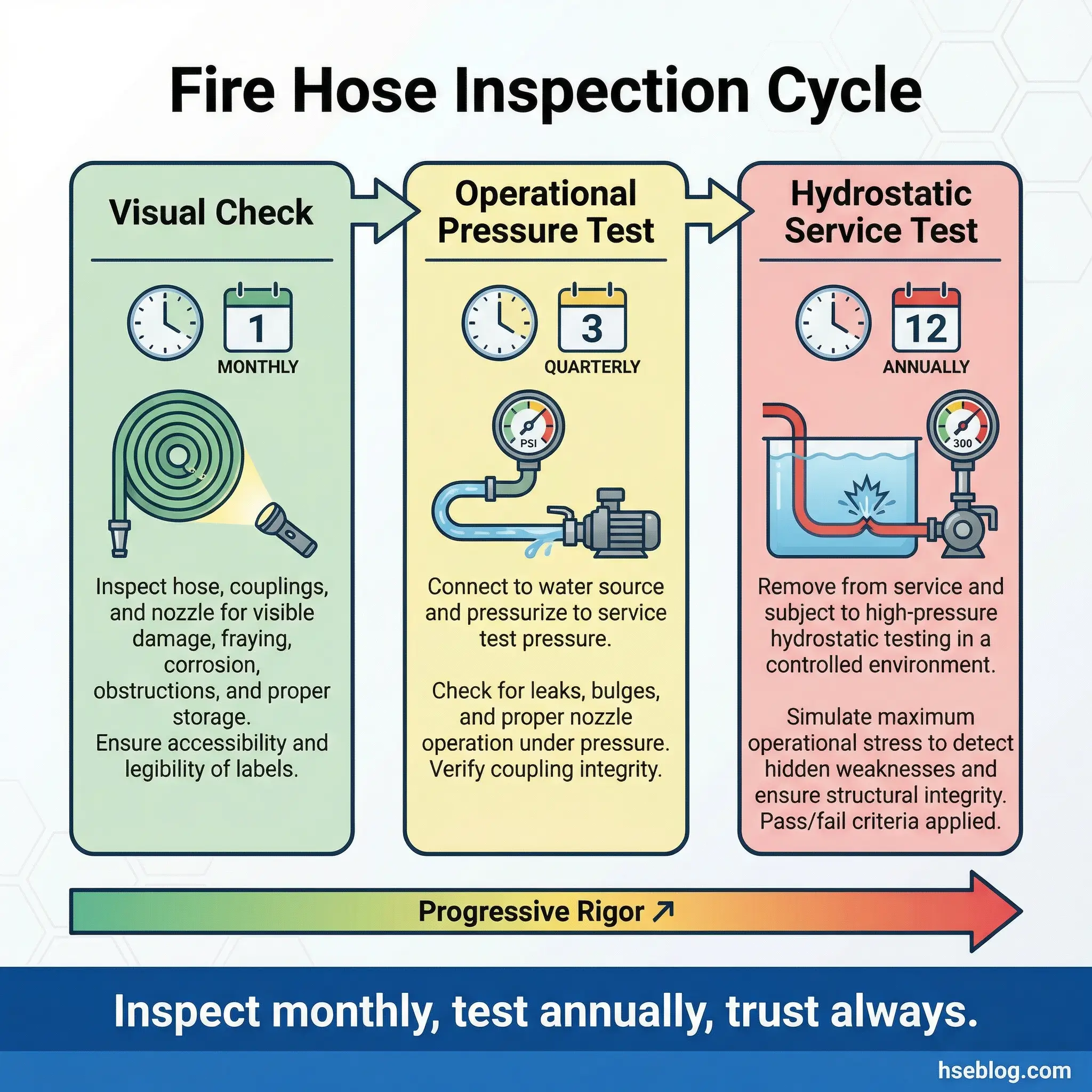 - Skipping hydrostatic testing: Annual pressure testing per NFPA 1962 catches liner failures and coupling leaks before they become deployment failures. Many industrial sites treat hose testing as optional rather than mandatory.