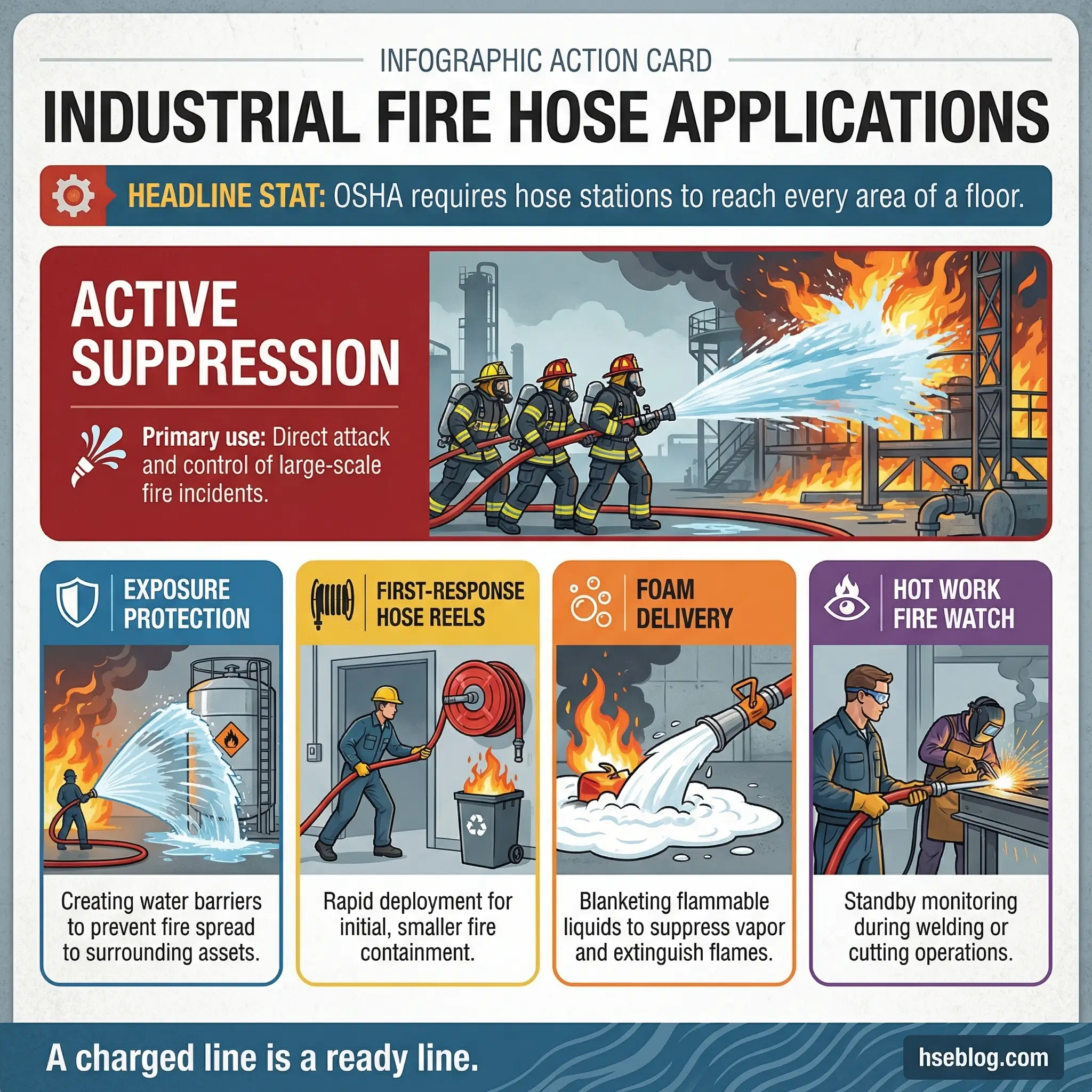 - Cooling operations during hot work: Charged standby hose lines are a standard fire watch requirement during welding, cutting, and grinding operations in facilities with combustible materials nearby.