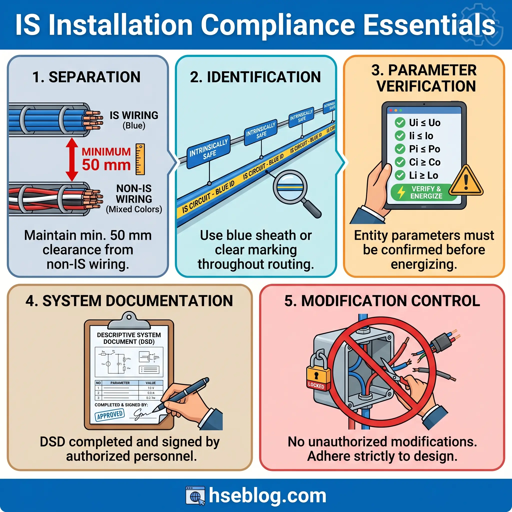 IS wiring must be physically separated from non-IS wiring. NEC Article 504 specifies a minimum separation of 50 mm (approximately 2 inches) when cables run in separate raceways or cable trays without a grounded metal partition. When a grounded barrier separates the circuits, no additional spacing is required. In practice, many facilities adopt a blanket policy of routing IS cables in dedicated trays identified with blue marking — a visual segregation that simplifies inspection and prevents future wiring additions from compromising separation distances.