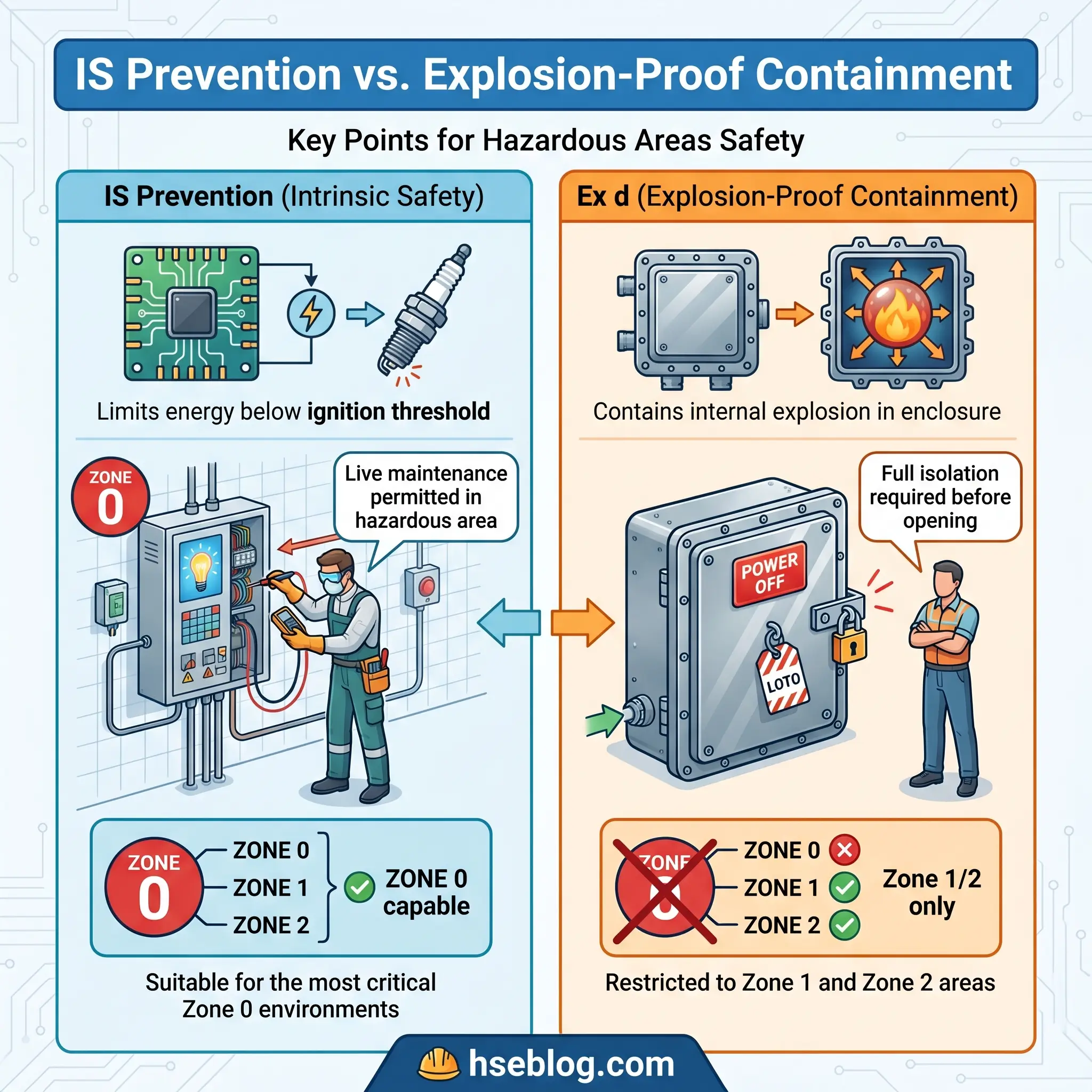 Every explosion requires three elements to converge: a fuel source (flammable gas, vapor, or combustible dust), an oxidizer (typically atmospheric oxygen), and an ignition source delivering sufficient energy to initiate combustion. Remove any one element and the explosion cannot occur. Most protection philosophies in hazardous area engineering accept that fuel and oxygen will be present and focus on managing the ignition source — but they take fundamentally different approaches to that management.