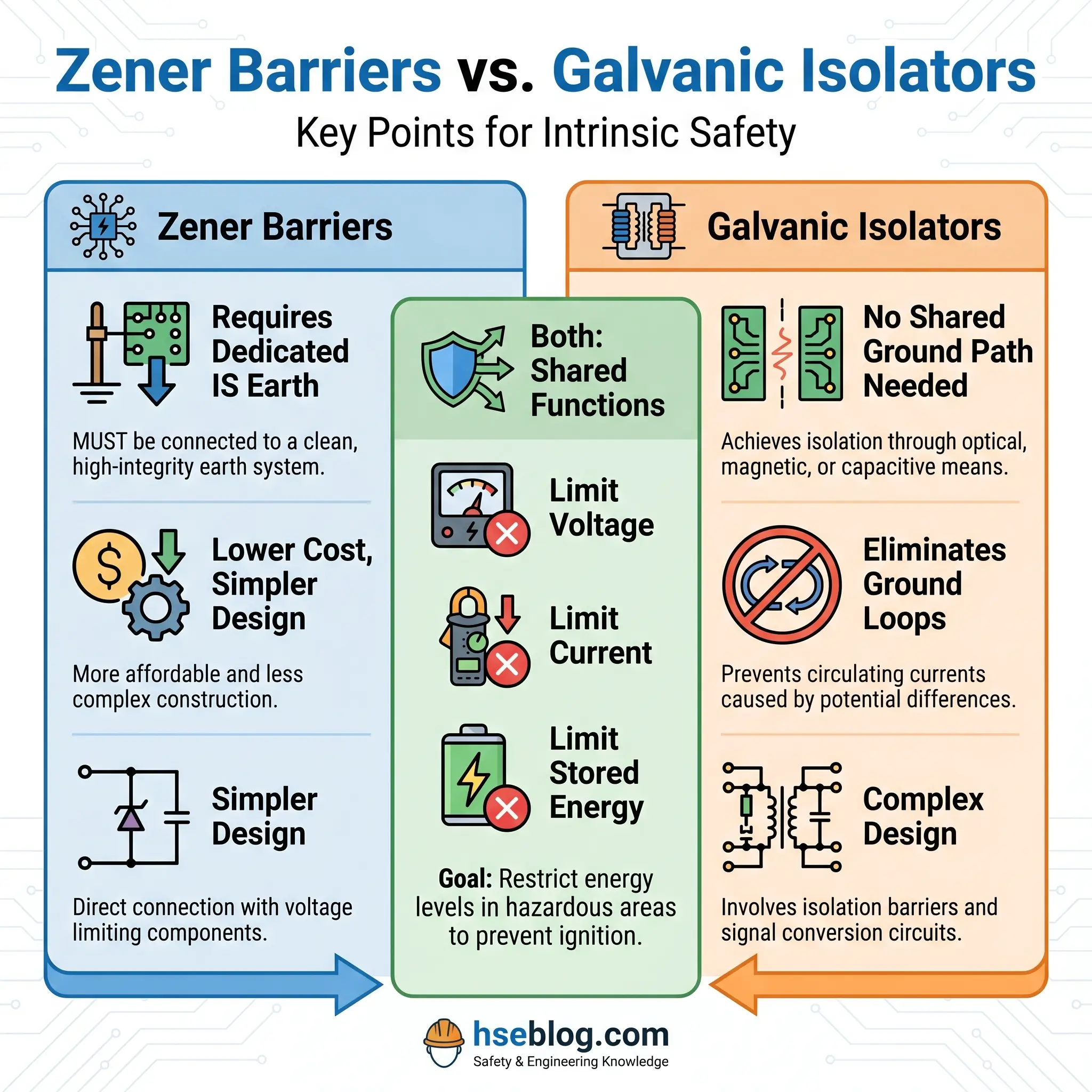 The devices that enforce these limits are called safety barriers, and they sit at the boundary between the safe area (the control room, the marshalling cabinet) and the hazardous area (the process zone, the tank farm). Two types dominate the industry.