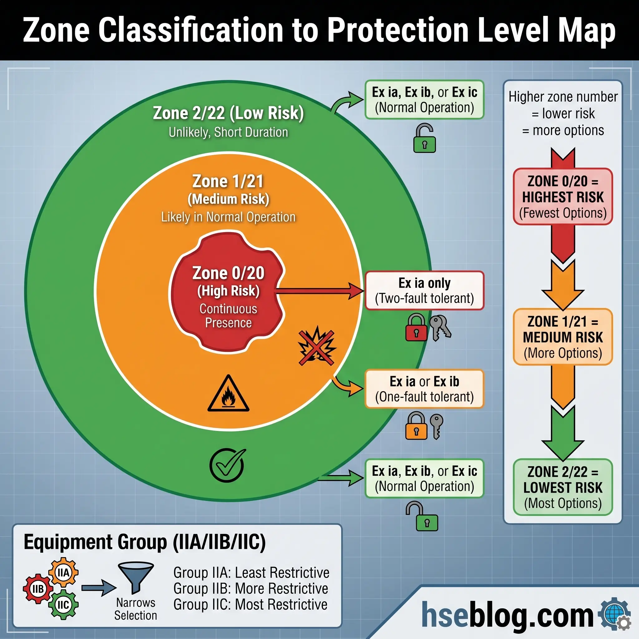 The zone or division classification directly determines the minimum protection level required. Zone 0 (or Division 1 for the most critical applications) demands Ex ia — the highest IS protection level, tolerant of two simultaneous faults. Zone 1 permits Ex ia or Ex ib. Zone 2 allows the use of Ex ic. The same logic applies to dust zones.