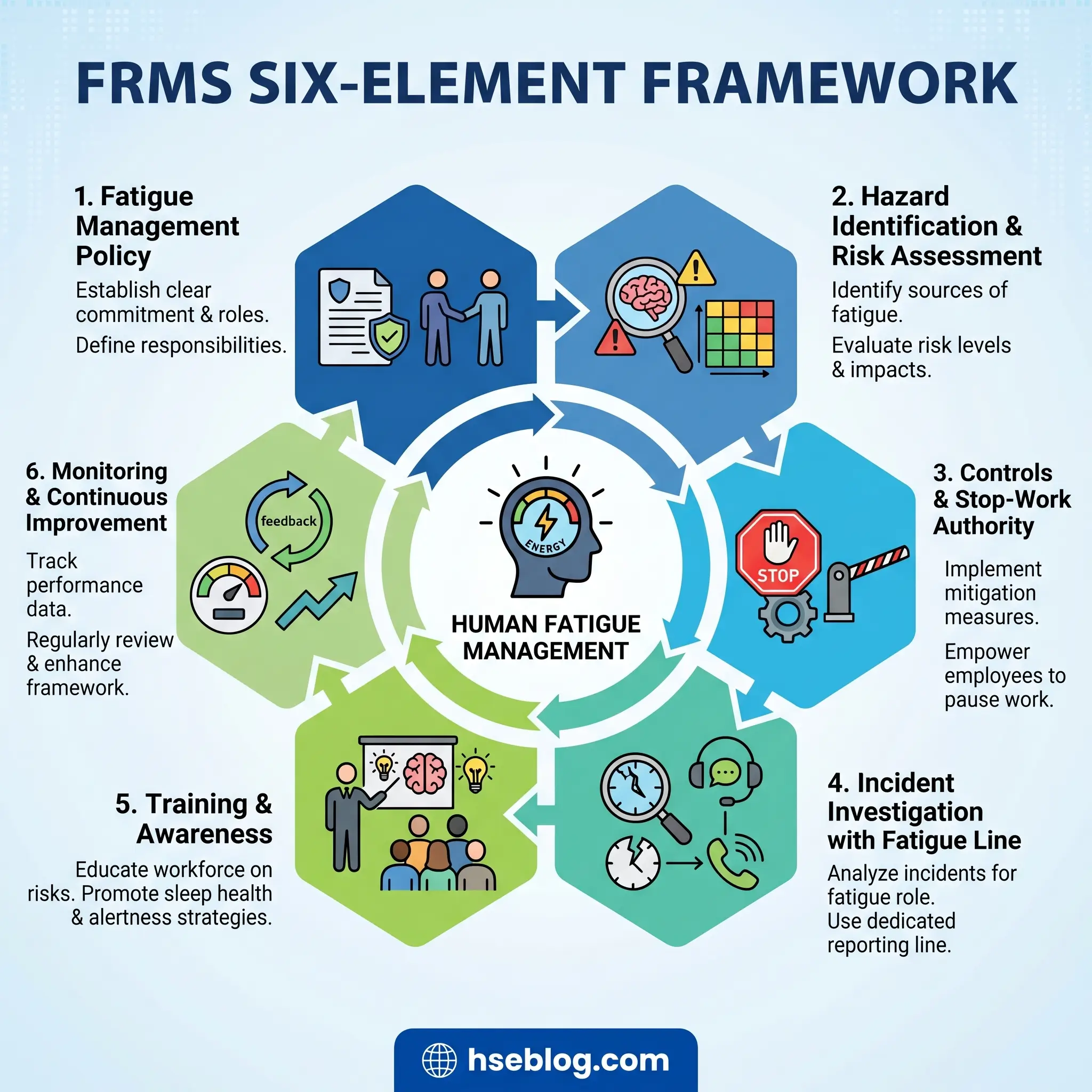An FRMS is the governance layer that sits on top of schedule design. It is what turns a rostering spreadsheet into a managed-hazard program defensible under ISO 45001 Clause 6.1. Drawing on ACOEM’s 2012 guidance, ICAO’s FRMS framework, and NIOSH’s work-schedules resources, six elements form the backbone.