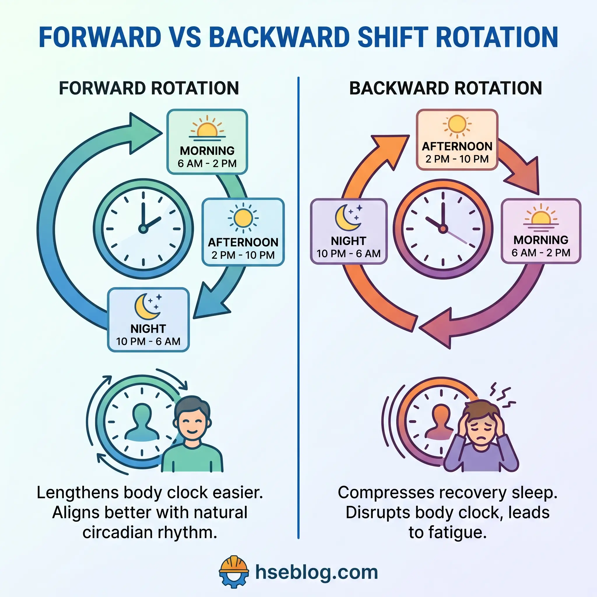 - Rotate forward, not backward. Morning → afternoon → night is easier for the circadian clock to accommodate than a reverse cycle. The internal clock lengthens more naturally than it shortens.