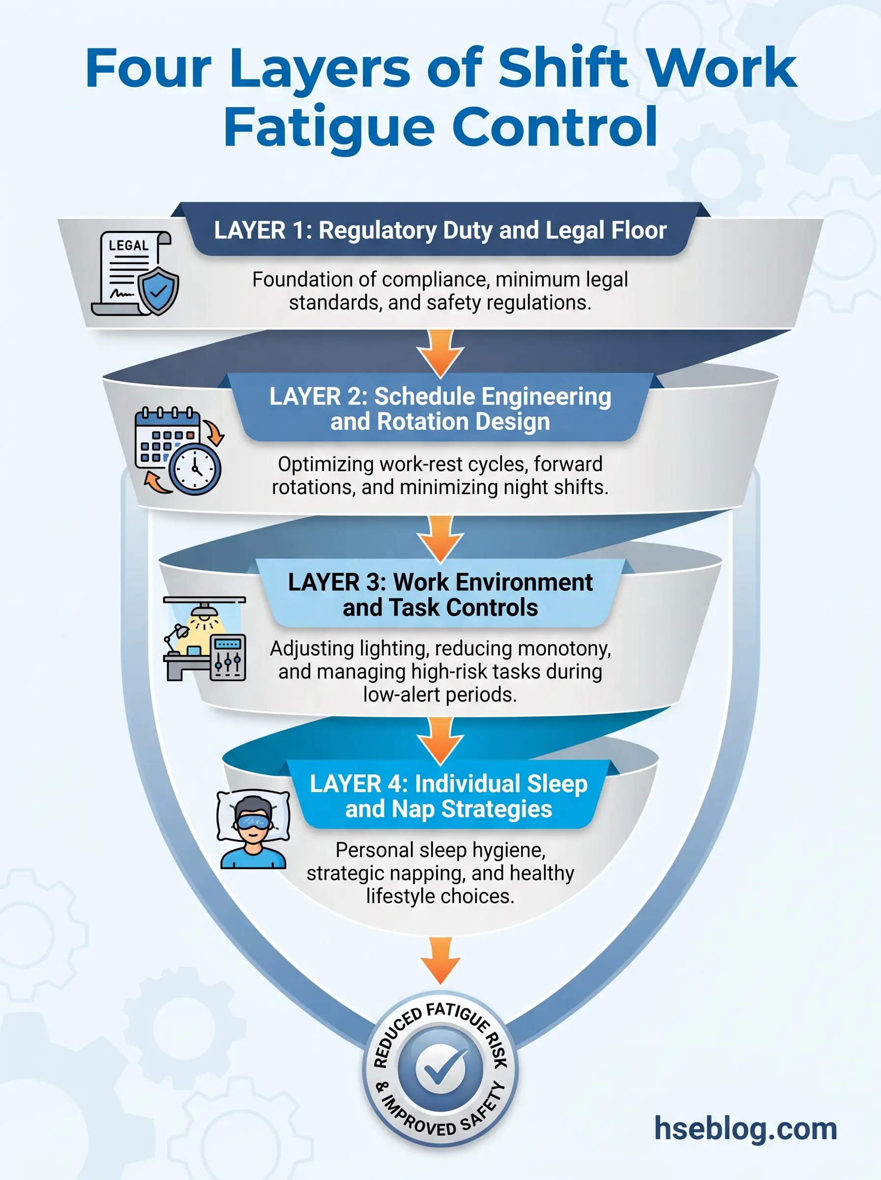 HSE HSG256 is explicit on this point: shift schedule design is the single most powerful control because it eliminates or reduces fatigue at the source. Engineering the roster sits above anything you can do with lighting, caffeine, or willpower.