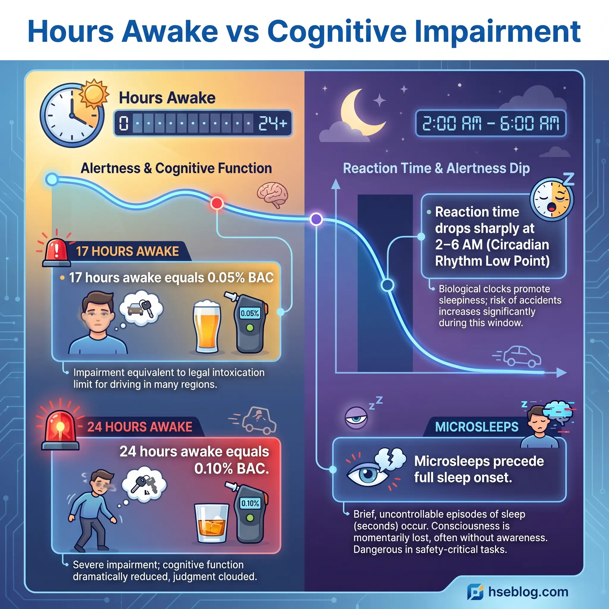 A calibration point every supervisor should carry: being awake for 17 hours produces cognitive impairment roughly equivalent to a blood alcohol content of 0.05%. Nobody on our site would hand a haul-truck key to someone at 0.05%. A worker 17 hours into a bad rotation is operationally indistinguishable.