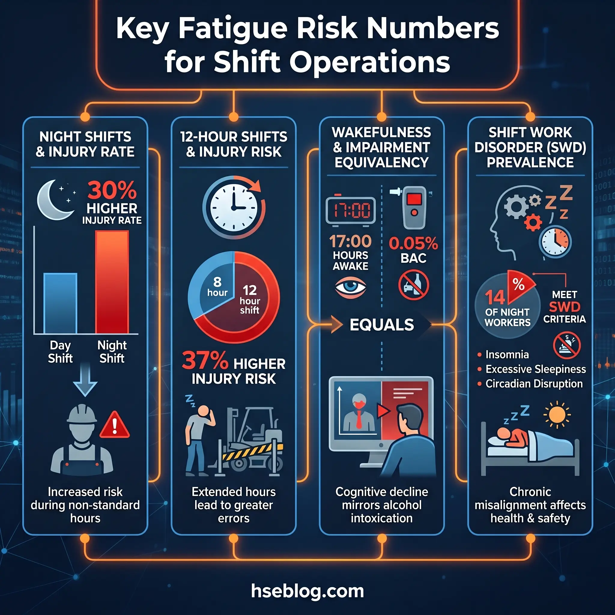 The published evidence is blunt. Injury rates run 18% higher on evening shifts and 30% higher on night shifts compared with day shifts. Working 12-hour days is linked to a 37% increase in injury risk. NIOSH’s own analysis puts accident and error risk up 28% on nights and 15% on evenings relative to a day-shift baseline.