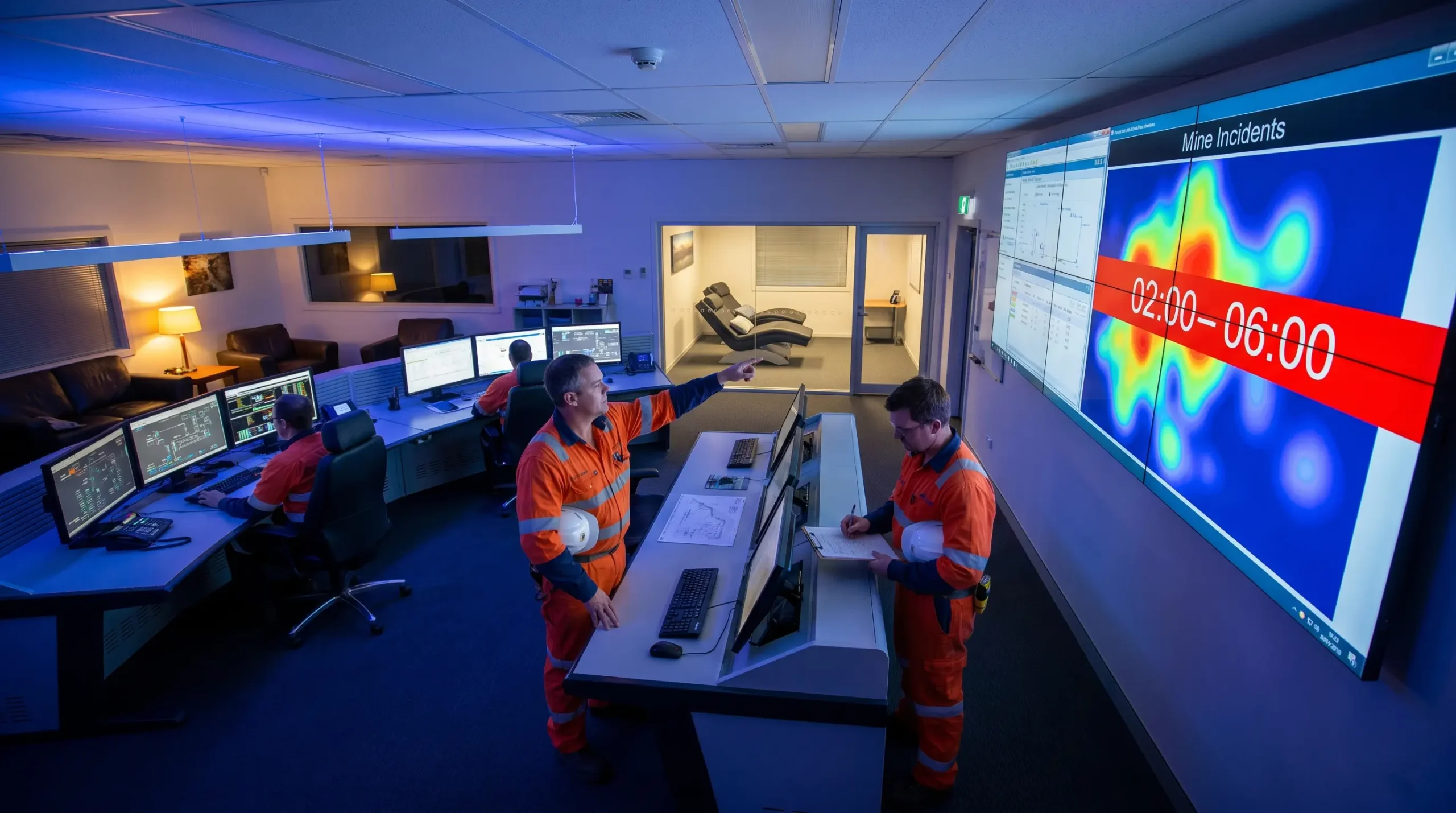 At 3:15 on a winter morning, the underground haul road sits at its quietest and its most dangerous. Low-lux emergency lighting throws cold pools onto the ribs, a 90-tonne truck cycles past the tip at the bottom of the decline, and in the surface control room the only sound is the slow tick of the ventilation fans. This is the circadian trough — the two-to-six window when core body temperature bottoms out, reaction times slow, and the brain will take microsleeps whether the operator consents or not. Behind the console, the night-shift dispatcher is on hour sixteen of a fourteen-day rotation.