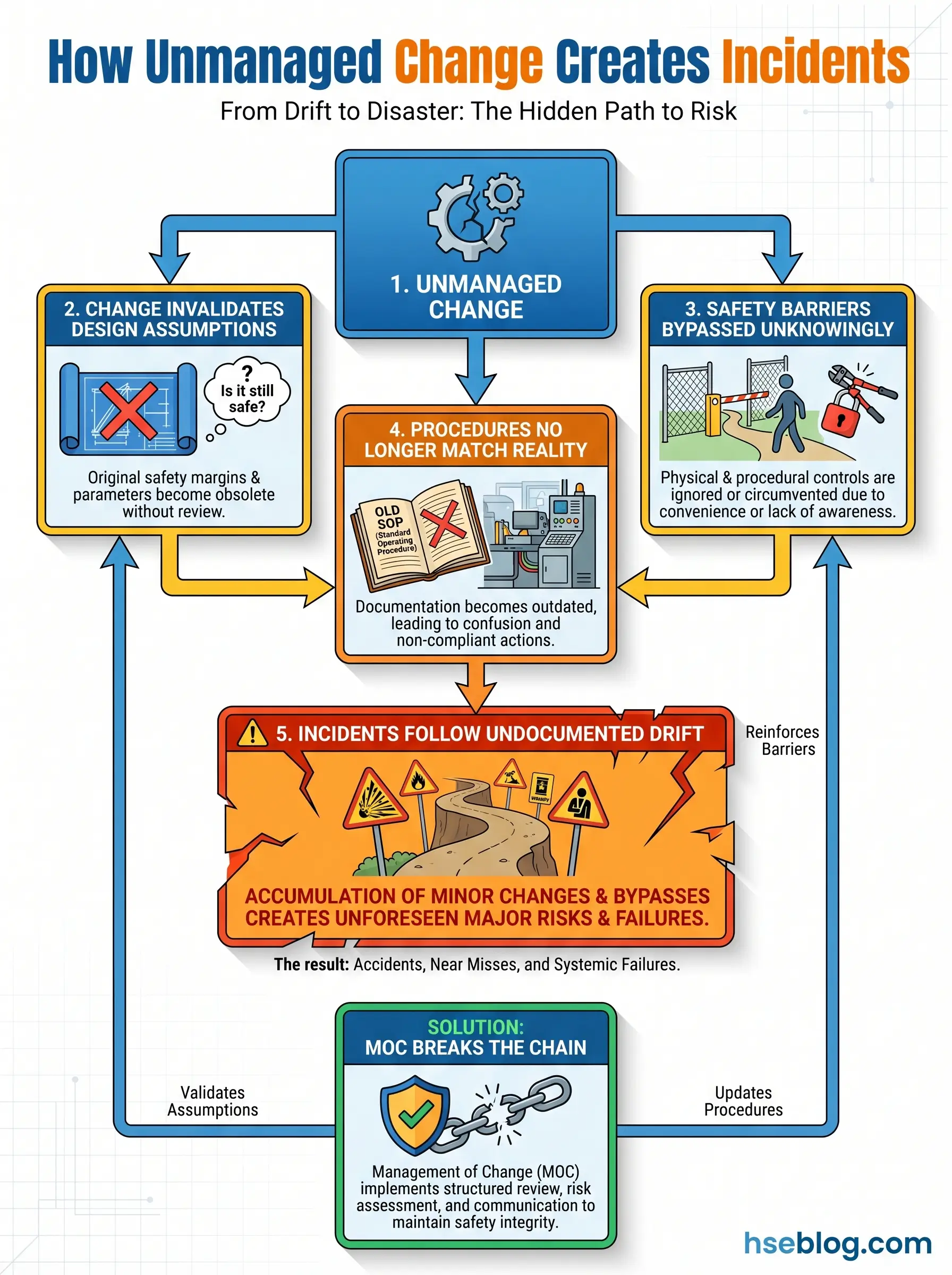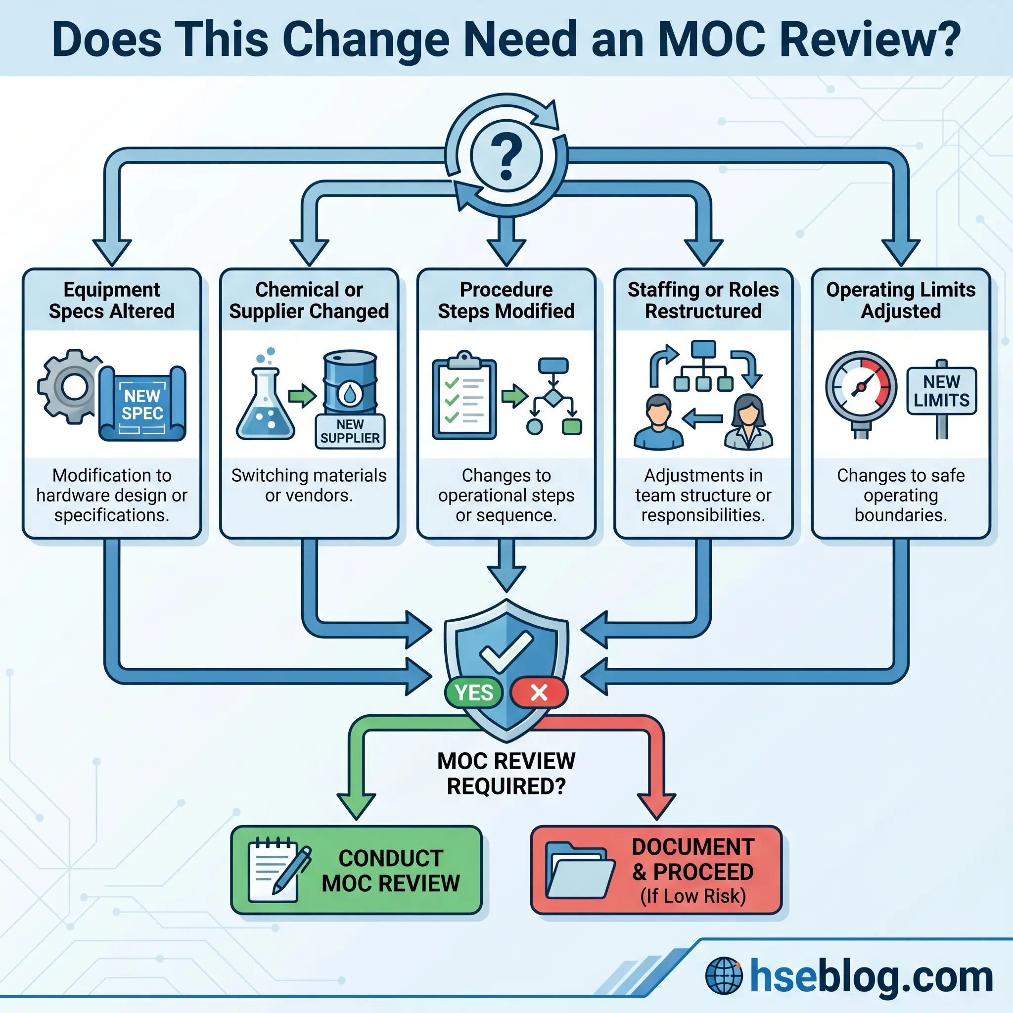 | Ignoring organizational changes | Staffing reductions, outsourced roles, and restructured responsibilities can degrade hazard control without touching a single piece of equipment. HSE UK explicitly flags this. | Include staffing, competency, and responsibility changes in MOC triggers. |