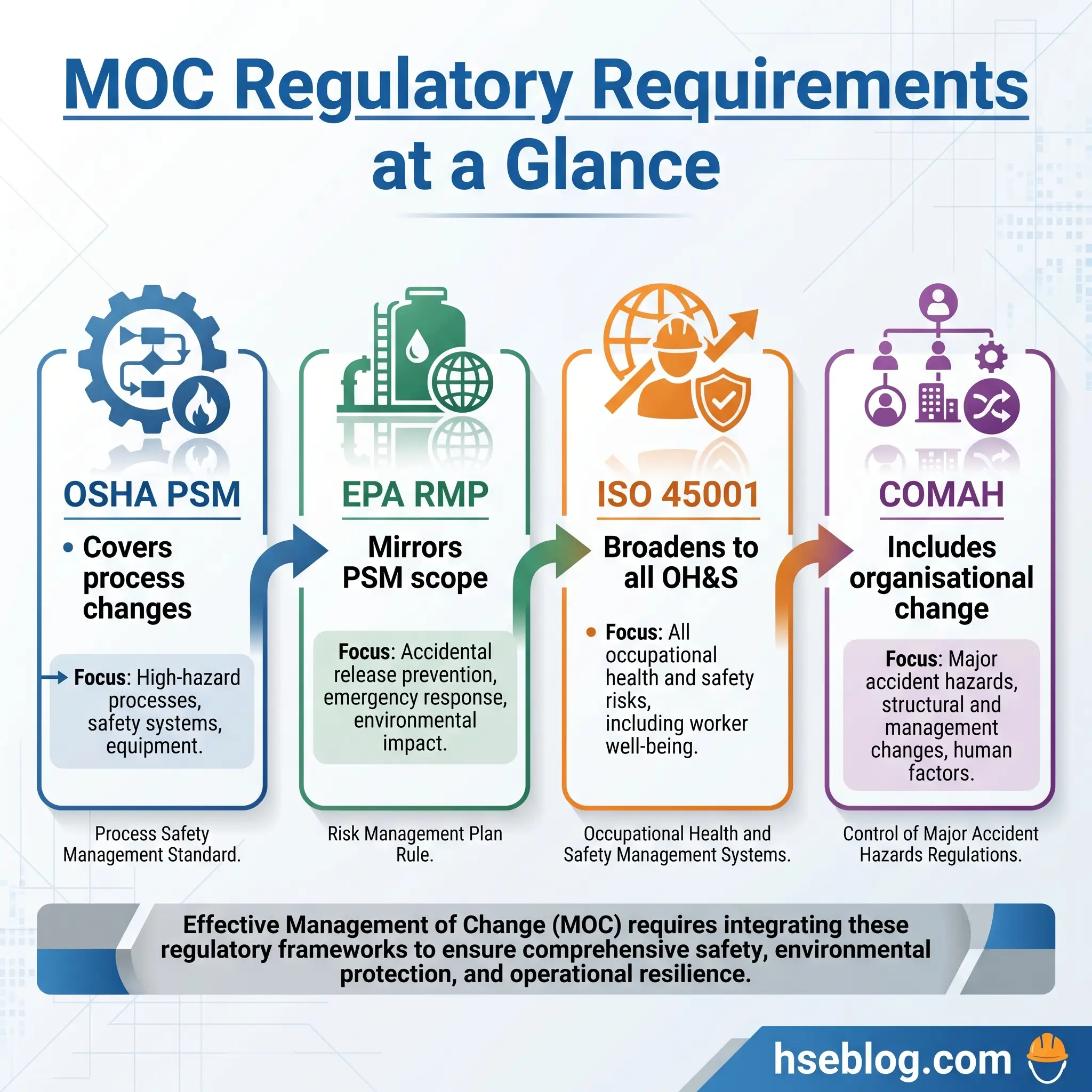 | OSHA PSM 29 CFR 1910.119(l) | Written MOC procedures for changes to chemicals, technology, equipment, procedures, and facilities in covered processes | If you operate a PSM-covered process, you must have a documented MOC procedure, assess every change before implementation, and train affected workers before startup |