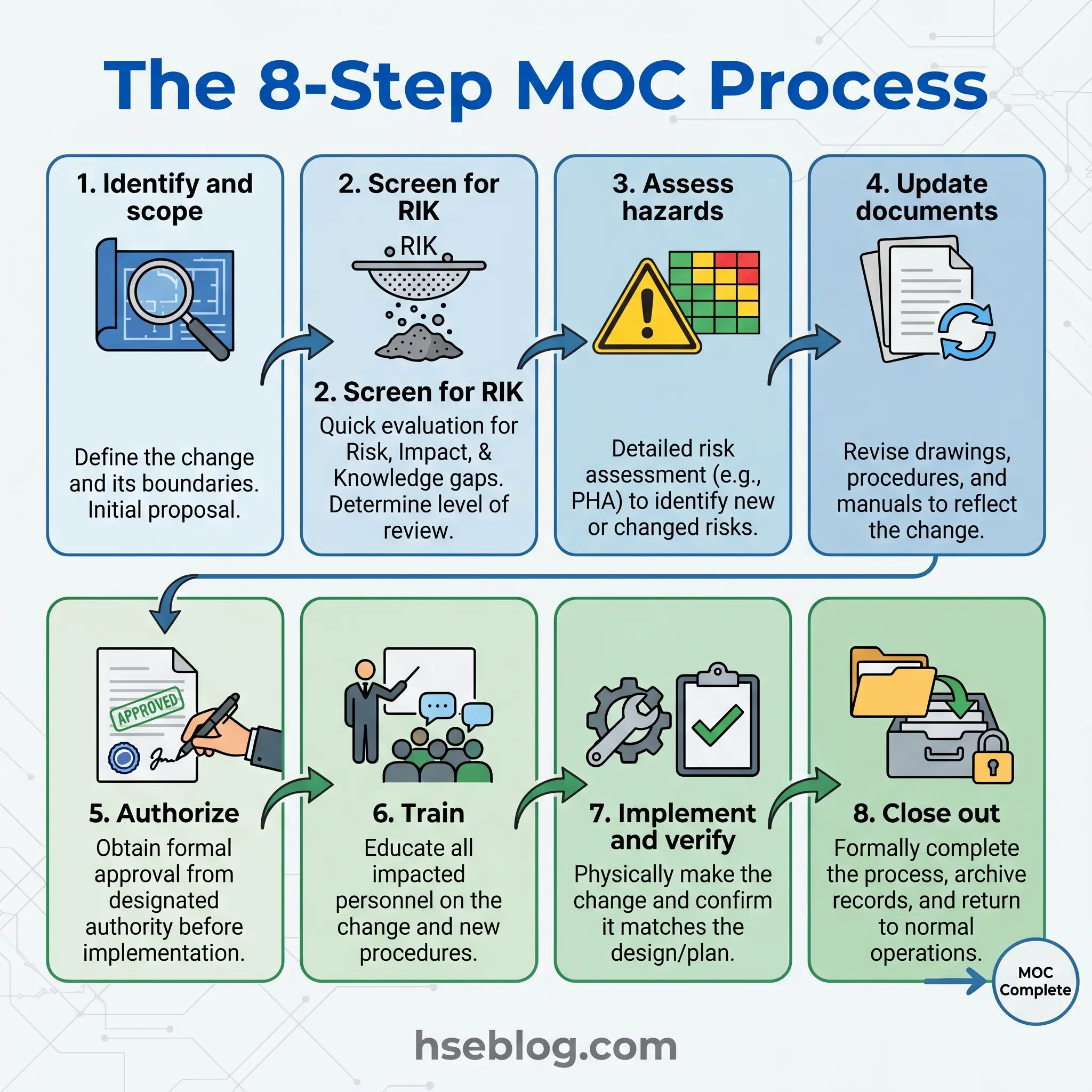 The MOC process is sequential and gate-based. No step is optional, and skipping ahead — implementing before assessing, or starting up before training — is how MOC fails. The flow below reflects what OSHA 29 CFR 1910.119(l) requires and what sound process safety practice demands, organized into eight steps that take a proposed change from identification through close-out.