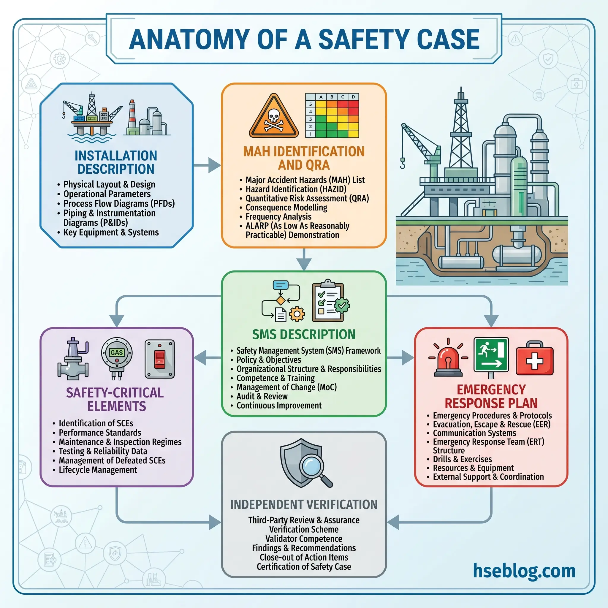 A safety case is a structured demonstration that the duty holder has identified the major accident hazards on the installation, assessed the risks arising from them, implemented controls that reduce those risks to ALARP, and has the emergency response capability to manage the residual risk. The document pulls together five core elements: a full installation description; the identification of major accident hazards with quantitative risk assessment (QRA); a description of the safety and environmental management system; the identification and performance standards for safety-critical elements (SCEs); and the emergency response plan including muster and evacuation arrangements.