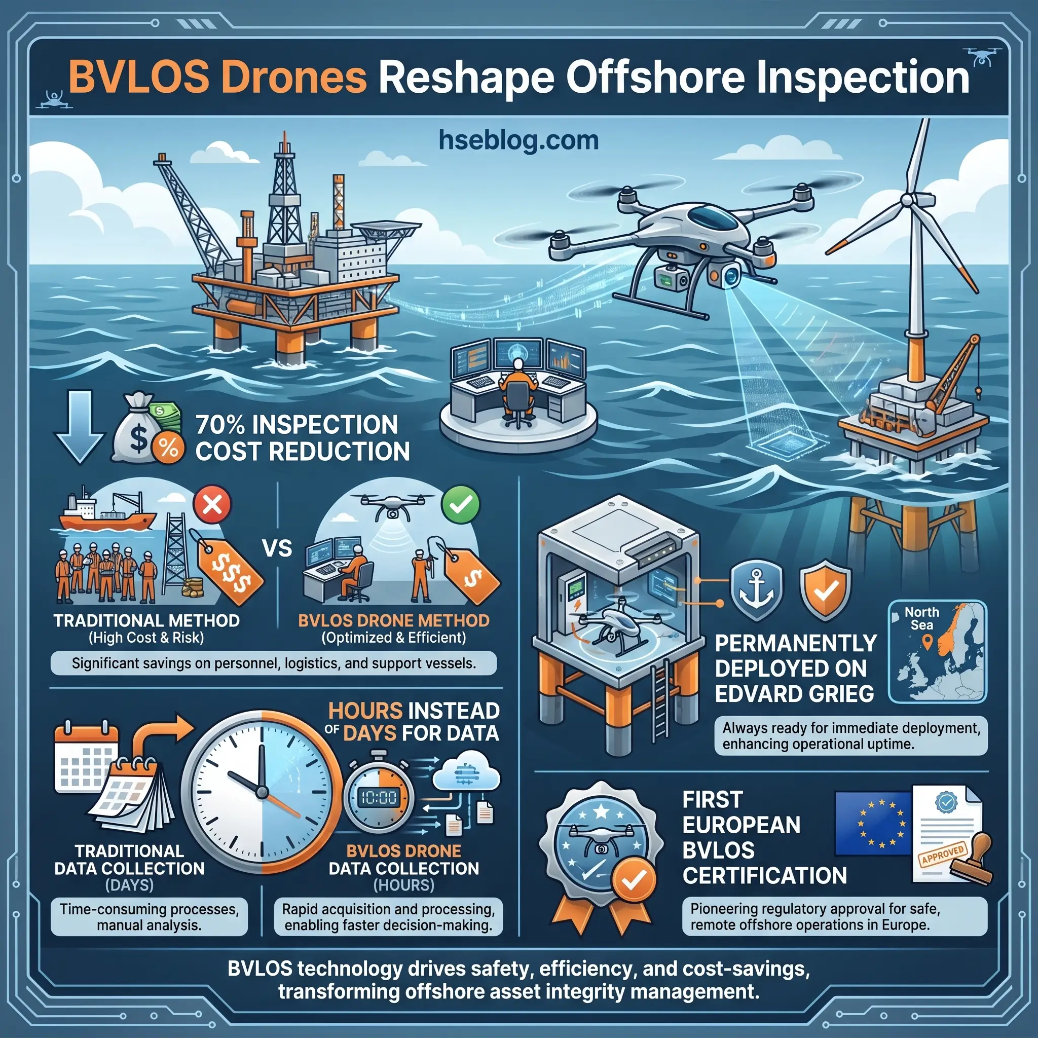 Autonomous drones now lead the curve. Aker Solutions became the first European company awarded full Beyond Visual Line of Sight (BVLOS) certification in 2025, enabling permanently deployed drones on the Edvard Grieg platform in the Norwegian North Sea. The company estimates inspection cost reductions of up to 70% and delivery of detailed structural inspection data within hours rather than days — with the larger safety benefit being the reduction of rope access and working-at-height exposure during routine inspection campaigns.