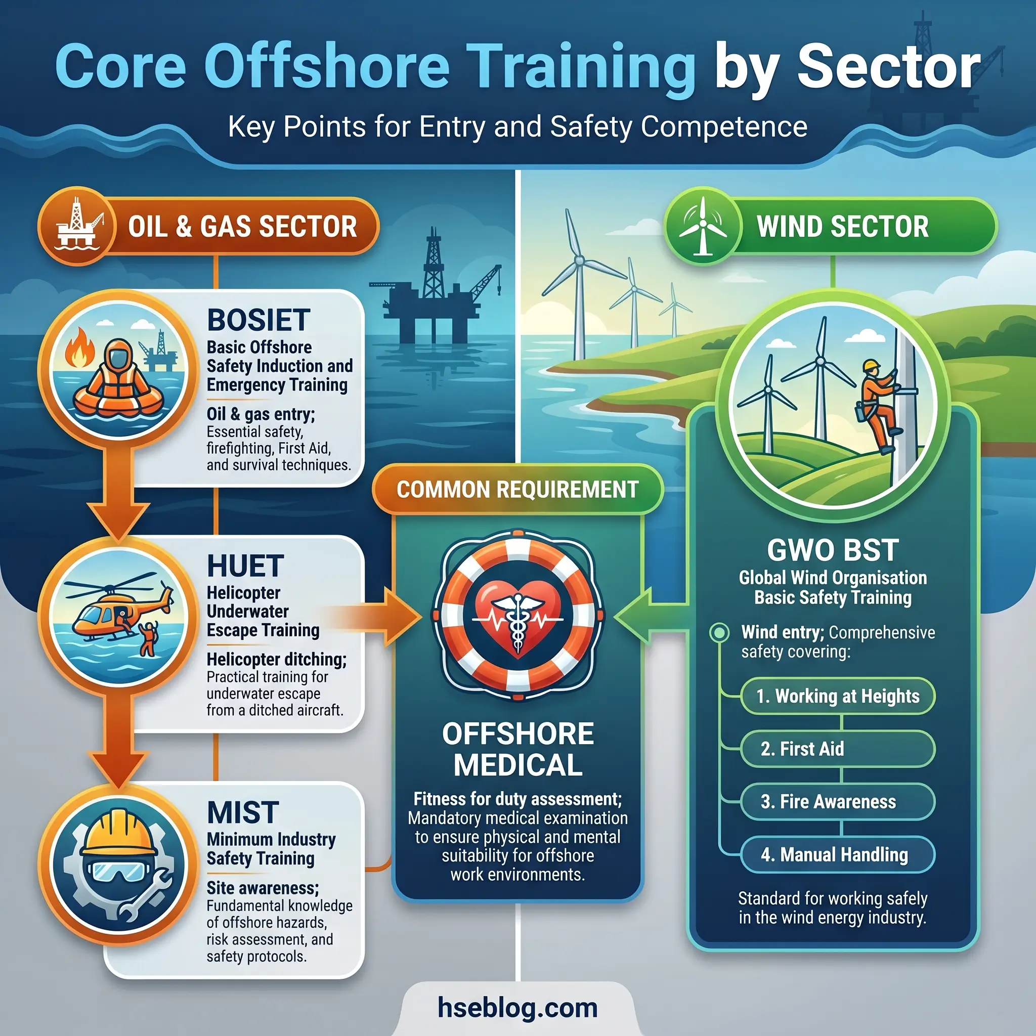 HUET — Helicopter Underwater Escape Training — is embedded in BOSIET but also exists as a standalone refresher for regular helicopter travellers. MIST or the international variant IMIST covers hazard awareness, working at height, confined spaces, manual handling, control of work, and H₂S awareness, with a two-year validity. Before any practical training, an OEUK offshore medical certificate (or jurisdictional equivalent) confirms fitness for the role.