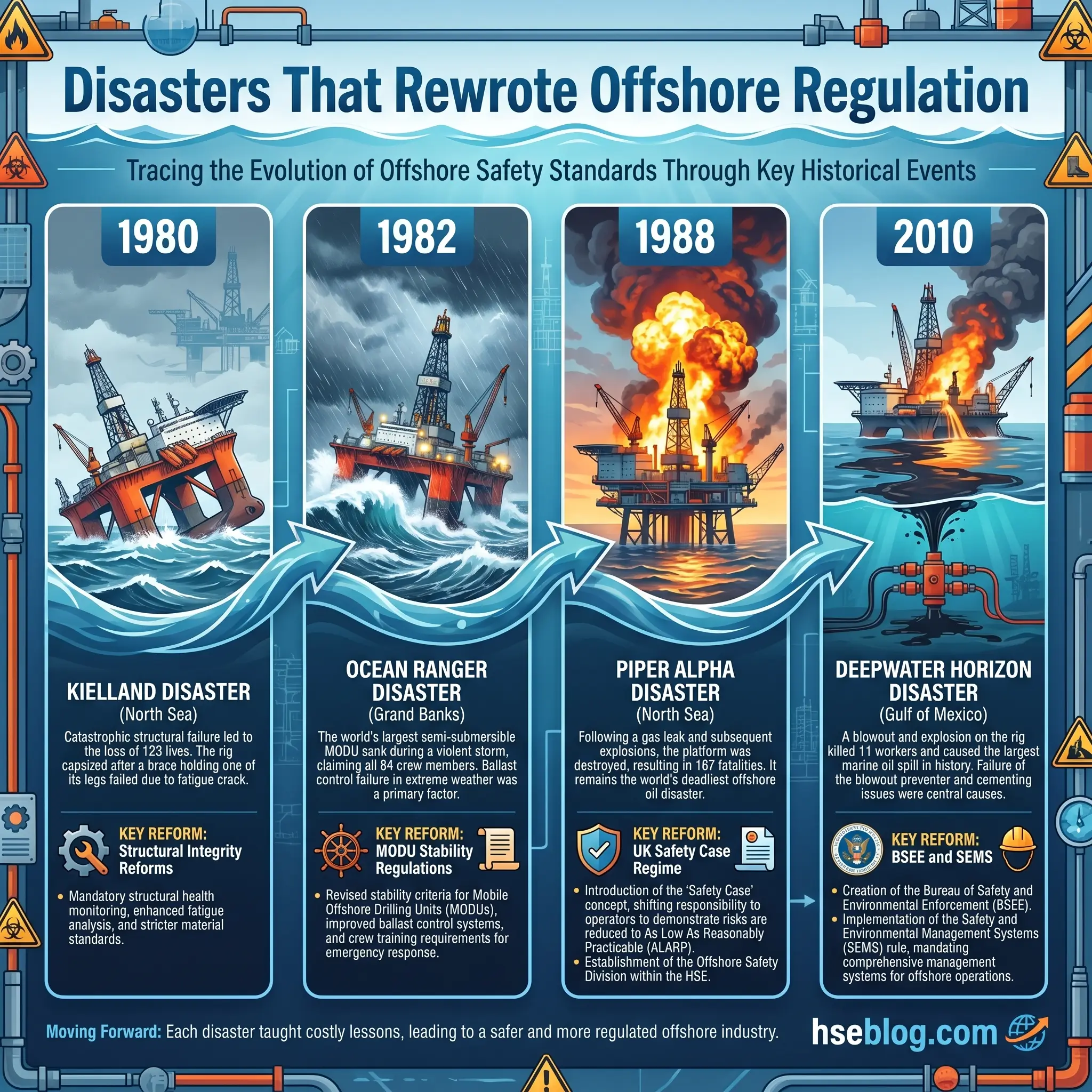 One hundred and sixty-seven people died on the night of 6 July 1988 when the Piper Alpha platform in the UK North Sea exploded and burned. Four offshore disasters in particular — Piper Alpha, Deepwater Horizon, Ocean Ranger, and Alexander L. Kielland — account for the shape of almost every major offshore regulation in force today.