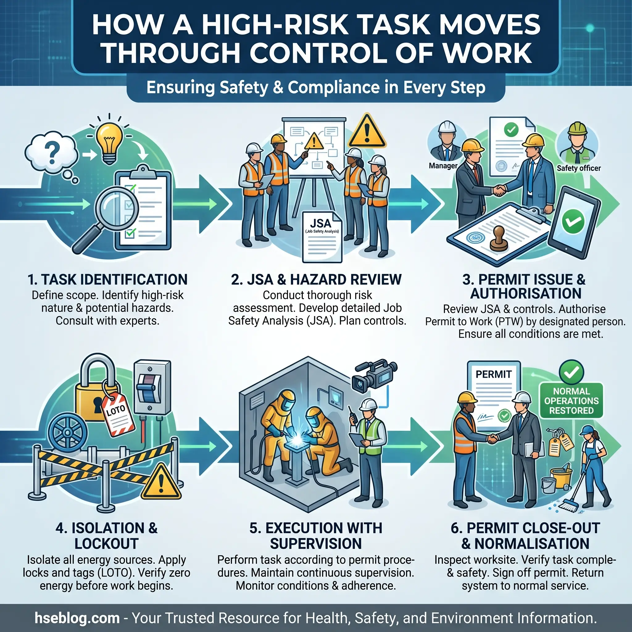 A typical high-risk task — say, replacing a section of hydrocarbon pipework inside a process module — flows through several gates. The task is identified and captured in the daily work plan. A Job Safety Analysis (JSA) or toolbox talk is held to walk the crew through the hazards and the controls. The permit-to-work is raised, reviewed against simultaneous operations (SIMOPS), authorised by the OIM or deputy, and signed by the performing authority. Energy isolation is applied under a lockout/tagout (LOTO) regime, verified by a second person, and tagged. The work is executed under supervision, with any changes triggering a stop-work and a re-authorisation. On completion, the permit is closed out, isolations are removed in a controlled sequence, and the system is normalised.