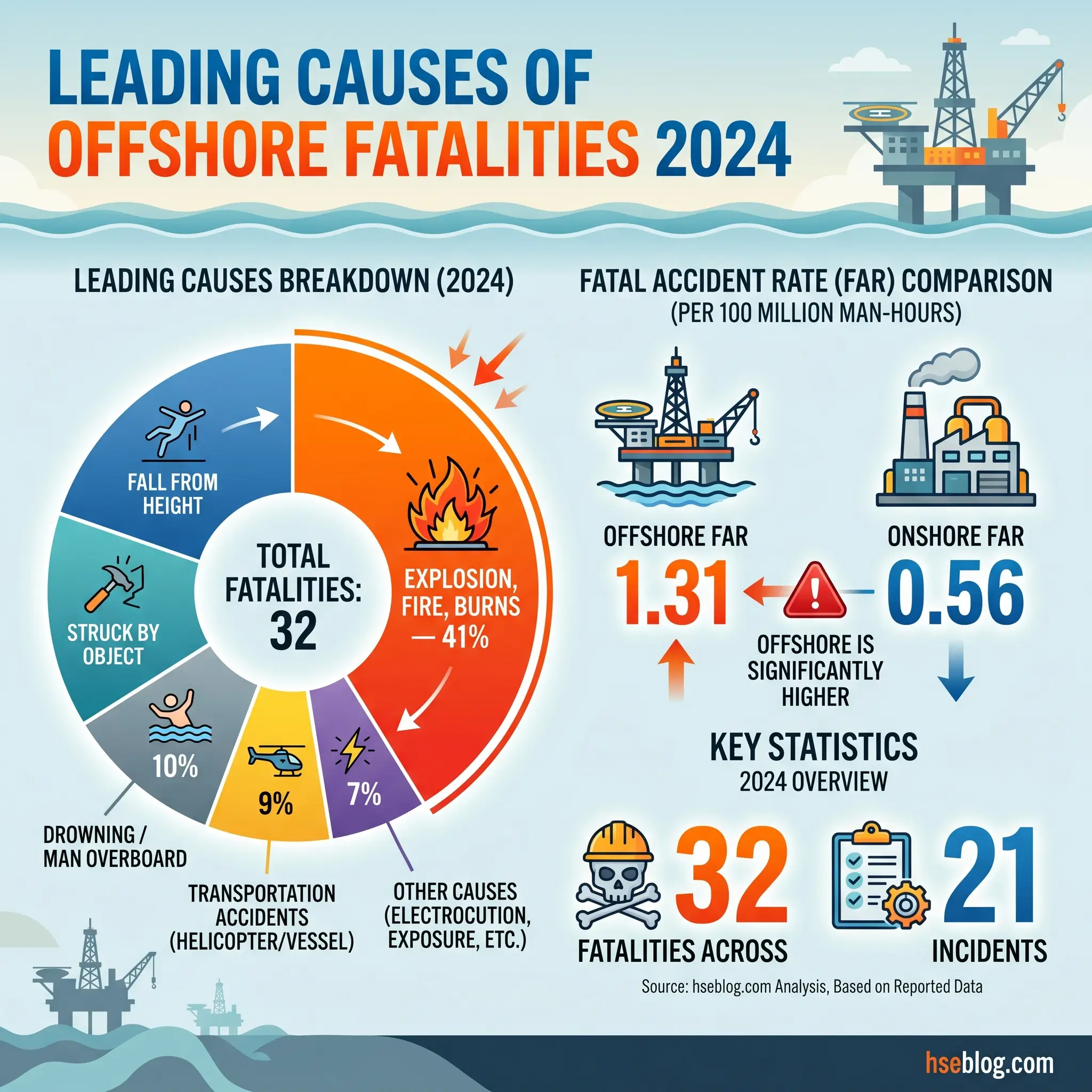 Hydrocarbon releases, pool and jet fires, vapour cloud explosions, loss of well control, blowouts, structural failure, and ship collision sit at the top of the risk register because any one of them can escalate into a multiple-fatality event. The IOGP Safety Performance Indicators for 2024 found that explosion, fire, or burns caused 41% of industry fatalities — 13 deaths across 5 incidents — making it the single largest cause category for the year. That pattern has been consistent across decades; it is the reason firewalls, blast walls, emergency shutdown logic, and temporary refuge endurance ratings are written into primary regulation rather than left to voluntary standards.