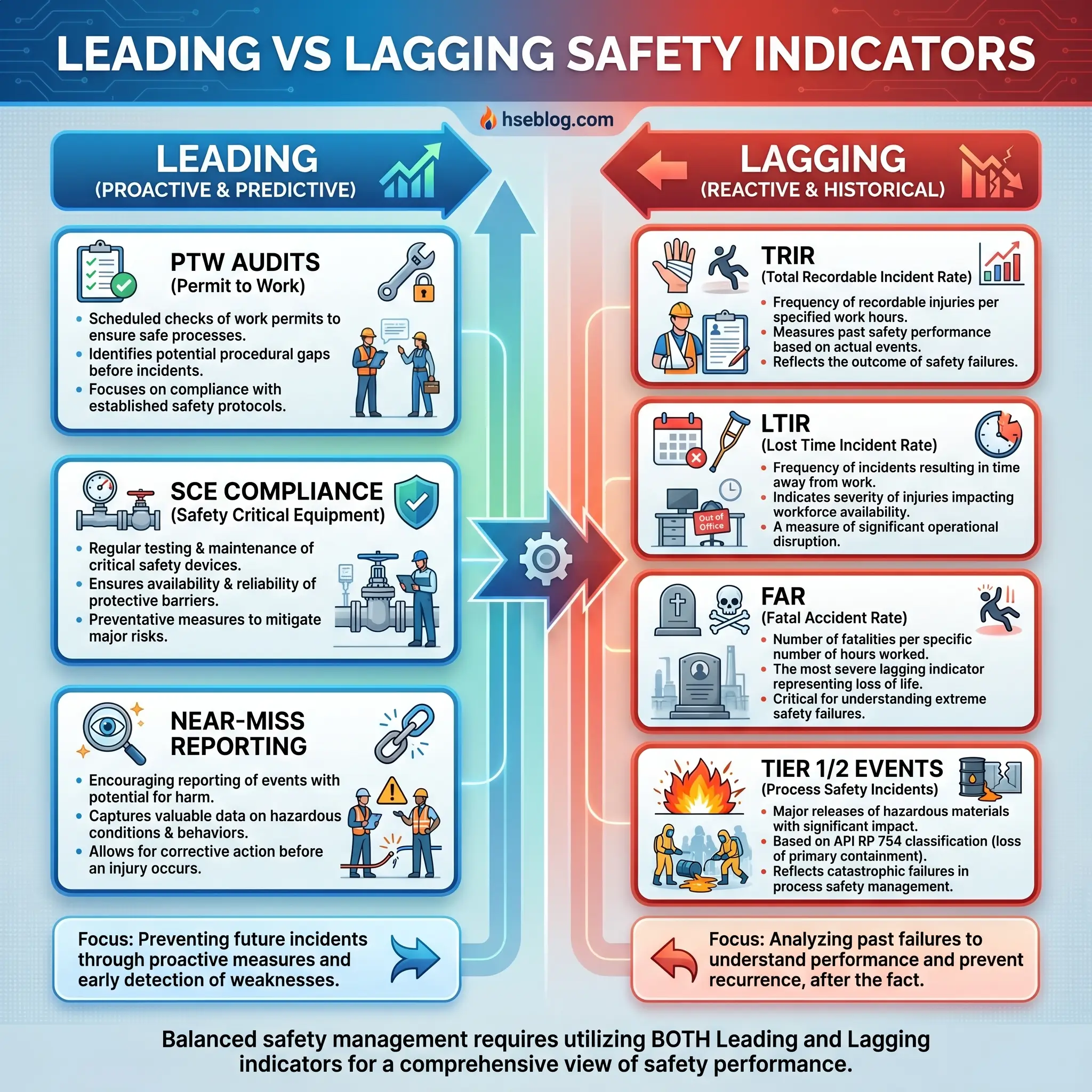 Just Culture frameworks distinguish between honest mistakes, at-risk behaviour, and reckless action — and apply proportionate responses to each. Without that framework, error reporting collapses and the organisation loses its most important leading indicator. Leading indicators offshore typically include permit-to-work audit scores, SCE performance standard compliance, safety observation program quality, and participation rates in near-miss reporting. Lagging indicators — Total Recordable Injury Rate (TRIR), Lost Time Injury Rate (LTIR), Fatal Accident Rate (FAR), and process safety event counts under the IOGP Tier 1 and Tier 2 definitions — tell the organisation what has already happened.