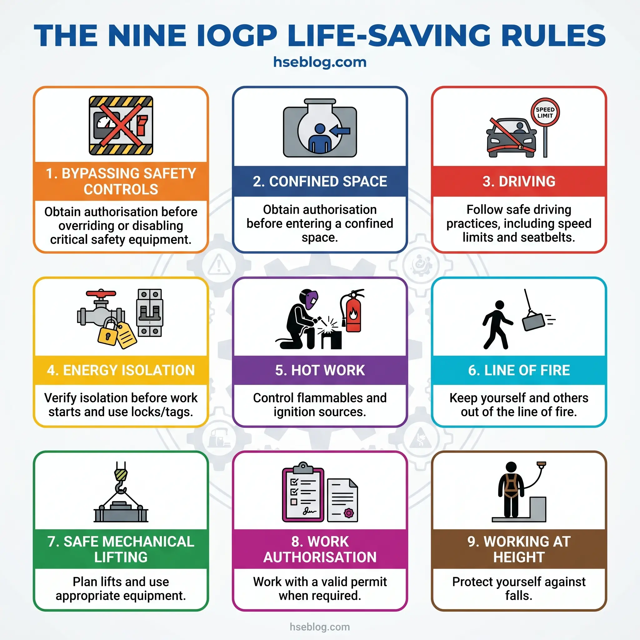 The Rules — explained in detail at the IOGP Life-Saving Rules library — cover the activities where fatalities concentrate. Each is deliberately framed as an individual worker behaviour rather than a management system element, because the failure mode being addressed is the moment of decision at the worksite. A rigger who won’t stand in the line of fire of a suspended load, a fitter who refuses to break containment without an isolation certificate, a roustabout who stops the job when the harness anchor point is wrong — that’s where the Rules live.