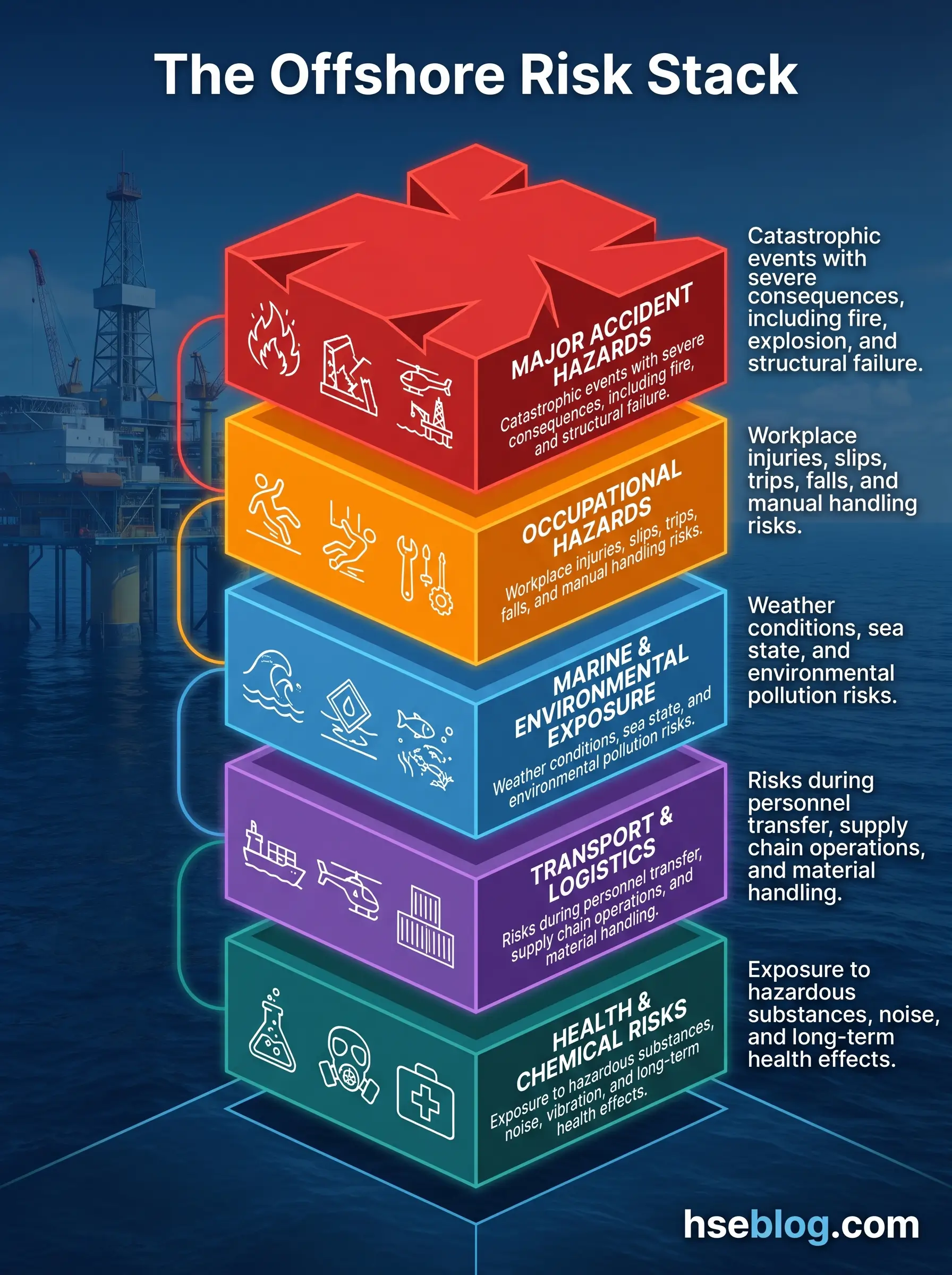 Practitioners tend to split offshore risk into two layers. The occupational layer covers the everyday hazards — dropped objects, falls, manual handling, slips on a wet grating deck. The major accident hazard (MAH) layer covers the low-frequency, high-consequence events that can destroy the installation or kill dozens at once: hydrocarbon releases, well blowouts, structural collapse, ship collision. Both layers are managed concurrently, but the MAH layer is what drives the regulatory architecture.