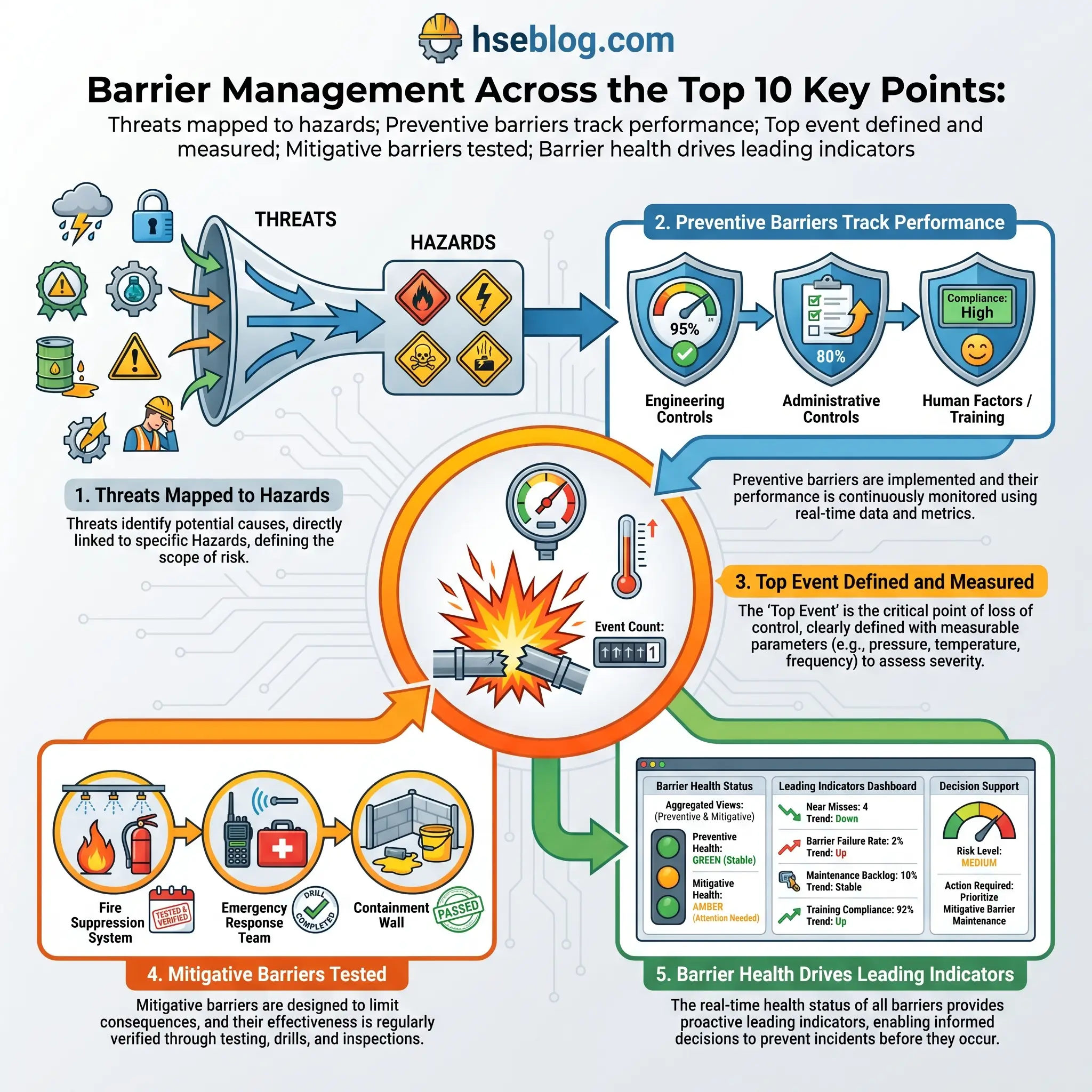 Barrier management is measurable in a way that control lists are not. A barrier health indicator tracks the condition of critical barriers over time — gas detector availability, ESD function test pass rates, relief valve test intervals, competency assurance coverage. A declining barrier health indicator is a leading signal of rising risk long before it shows in incident data.