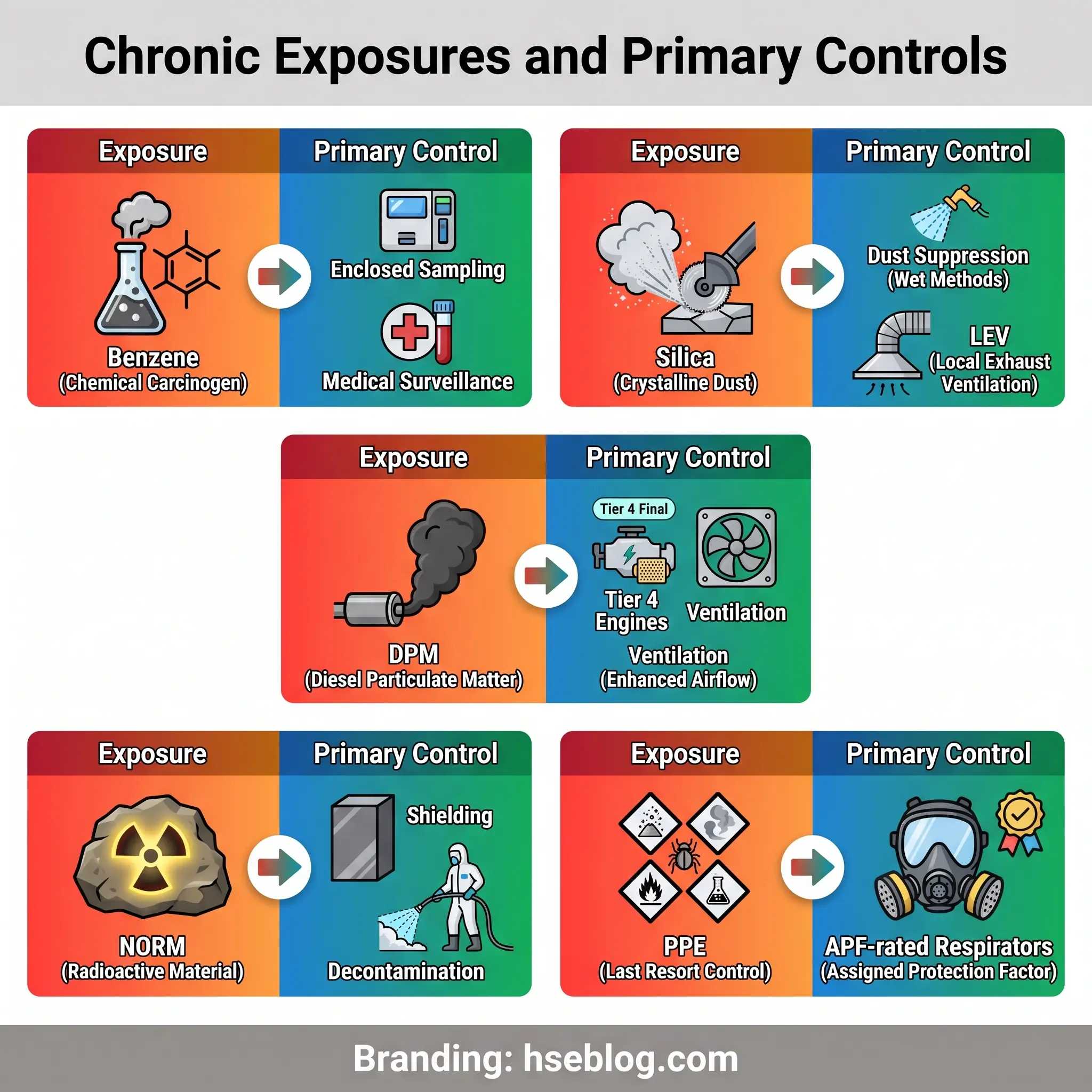 Beyond H₂S, oil and gas workers face a chronic exposure profile that causes disease rather than acute injury. The health consequences often manifest years or decades after exposure, which is why the administrative rigour around chemical control is disproportionate to the visible risk at any single shift.
