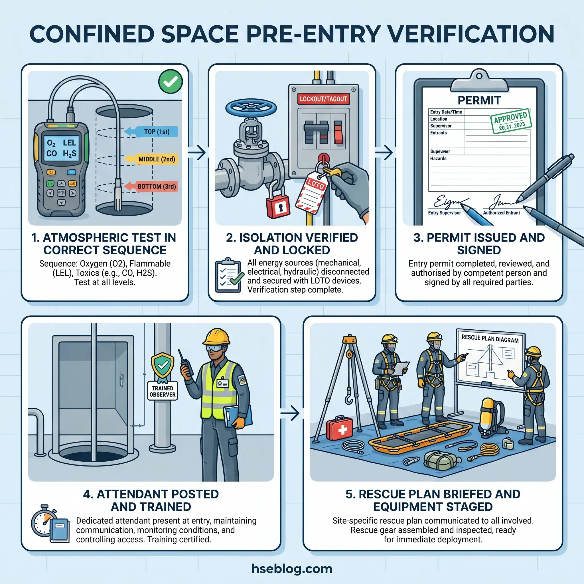 The control architecture is tight and well defined. Engineering: forced ventilation, atmospheric monitoring with data logging, mechanical isolation of feed lines, de-energisation of agitators and internal equipment. Administrative: a written permit-required confined space programme under OSHA 29 CFR 1910.146 (or the Confined Spaces Regulations 1997 in UK operations), pre-entry atmospheric testing in the correct sequence, a trained attendant stationed outside who cannot be reassigned, entrants with defined identification and duration limits, and — critically — a written rescue plan that does not rely on improvised response.