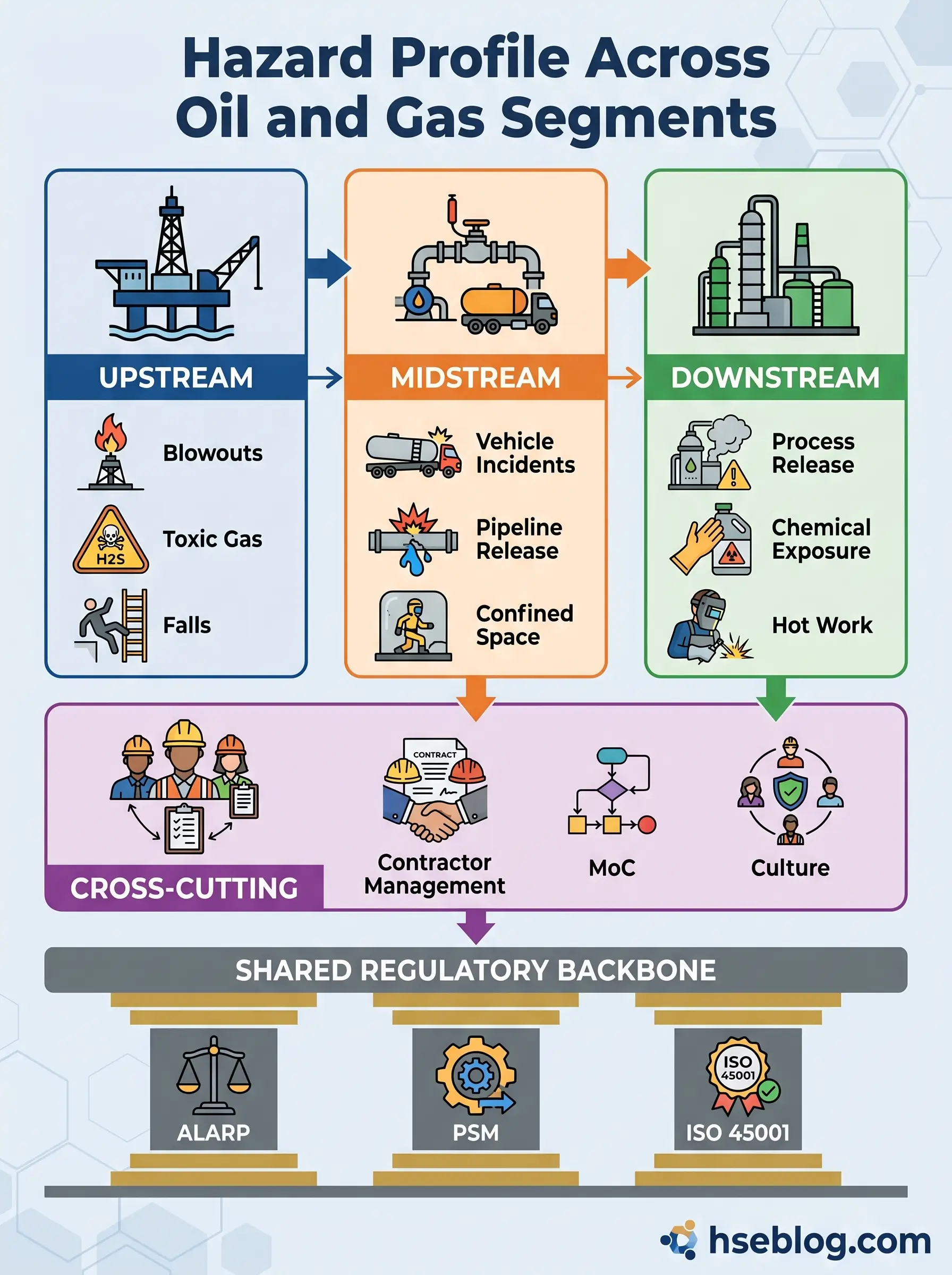 The industry operates across three broadly different worlds. Upstream covers exploration, drilling, and production — the rigs, platforms, and well pads where hydrocarbons are pulled out of the ground. Midstream moves the product through pipelines, rail, road, and tankers. Downstream is refining, petrochemical conversion, and distribution to end users. The hazards overlap heavily but the dominant risks shift. A drilling crew thinks about blowouts first; a refinery shift supervisor thinks about hydrocarbon release and runaway reactions; a pipeline operator thinks about third-party damage and dispersion modelling. This article applies one consistent framework — the hierarchy of controls — across all three segments.