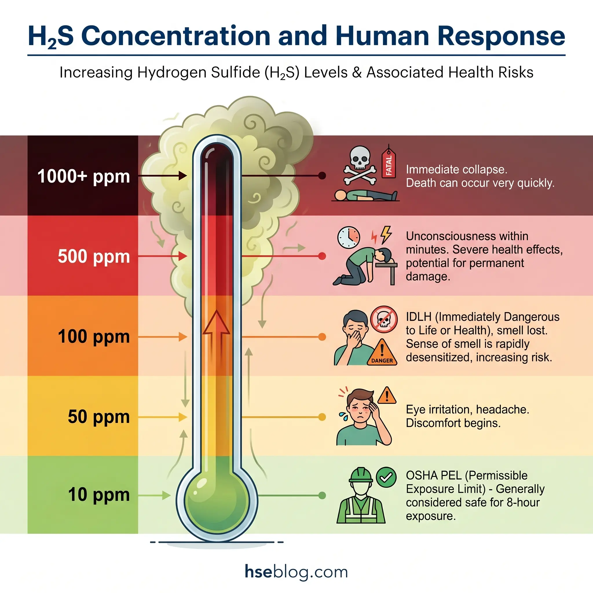 H₂S earns its own hazard section because its lethality profile is unlike any other toxic gas on an oil and gas site. OSHA’s permissible exposure limit sits at 10 ppm. NIOSH’s Immediately Dangerous to Life or Health level is 100 ppm. Above 500 ppm, unconsciousness occurs in seconds and death follows in minutes without intervention. What makes H₂S genuinely dangerous, though, is the biology: at concentrations around 100 ppm the olfactory nerves are paralysed within a few breaths, and the characteristic “rotten egg” warning smell vanishes. Workers have walked into lethal atmospheres convinced the gas had cleared because they could no longer smell it.