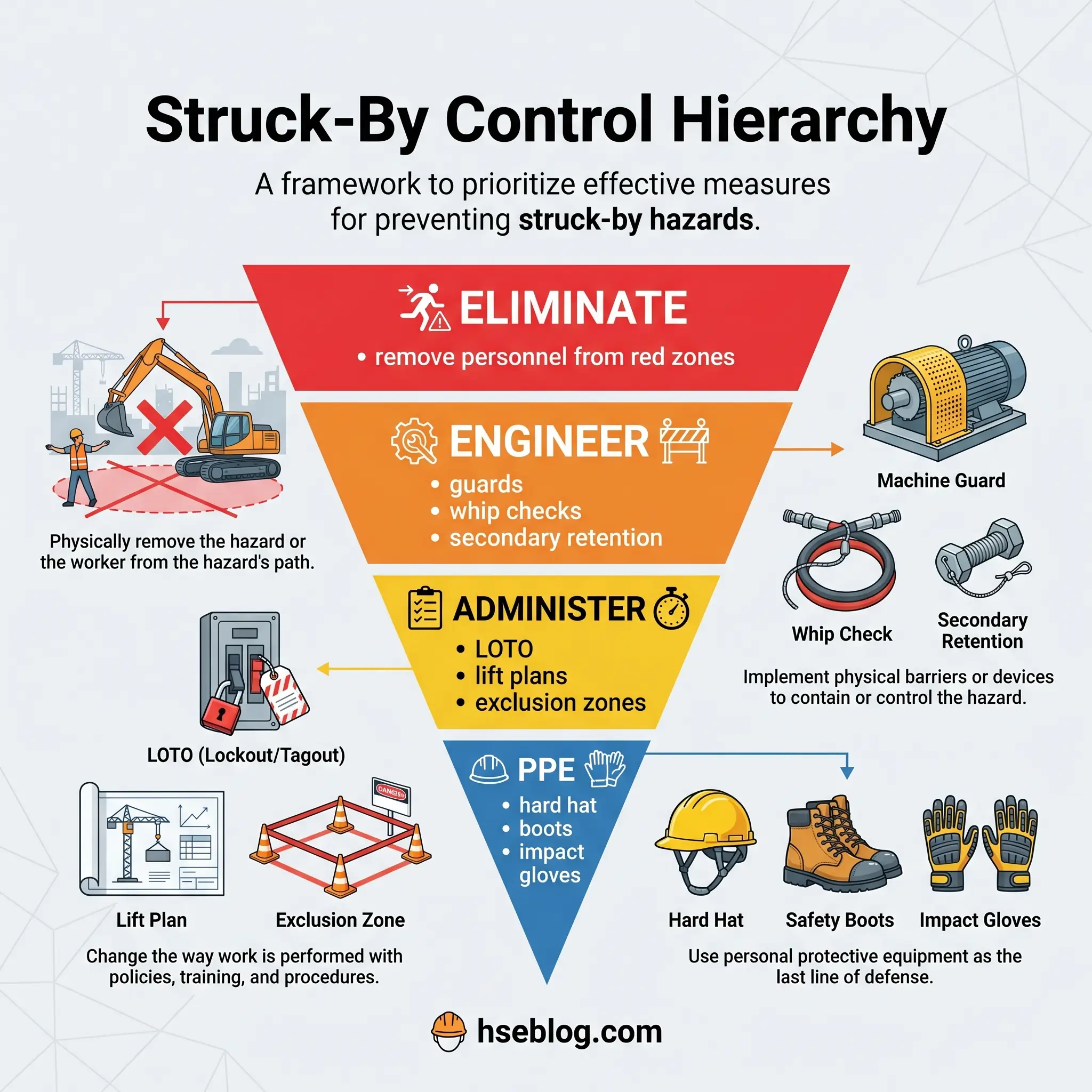 Engineering controls start with machine guarding under OSHA 29 CFR 1910.212 — fixed guards on belts, pulleys, gears, and any rotating component accessible to a worker. Whip checks on high-pressure hoses prevent the hose end from becoming a projectile if the connection fails. Secondary retention for tools at height — lanyards, tethers, tool buckets — prevents the dropped object scenario. Crane load paths are engineered and enforced; lifting operations over live process units require a documented lift plan and a dedicated lift supervisor.
