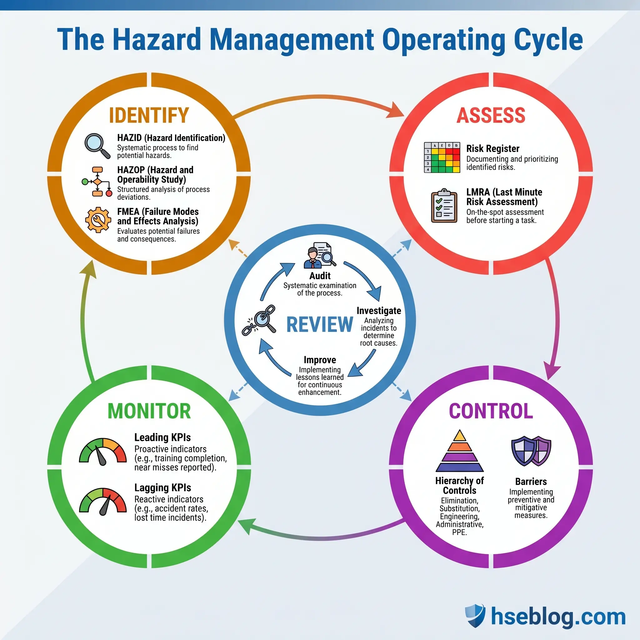 A practitioner framework pulls all ten hazards and their controls into a single operating cycle. The HSE management system lifecycle — identify, assess, control, monitor, review — is the organising principle every operator ultimately converges on.