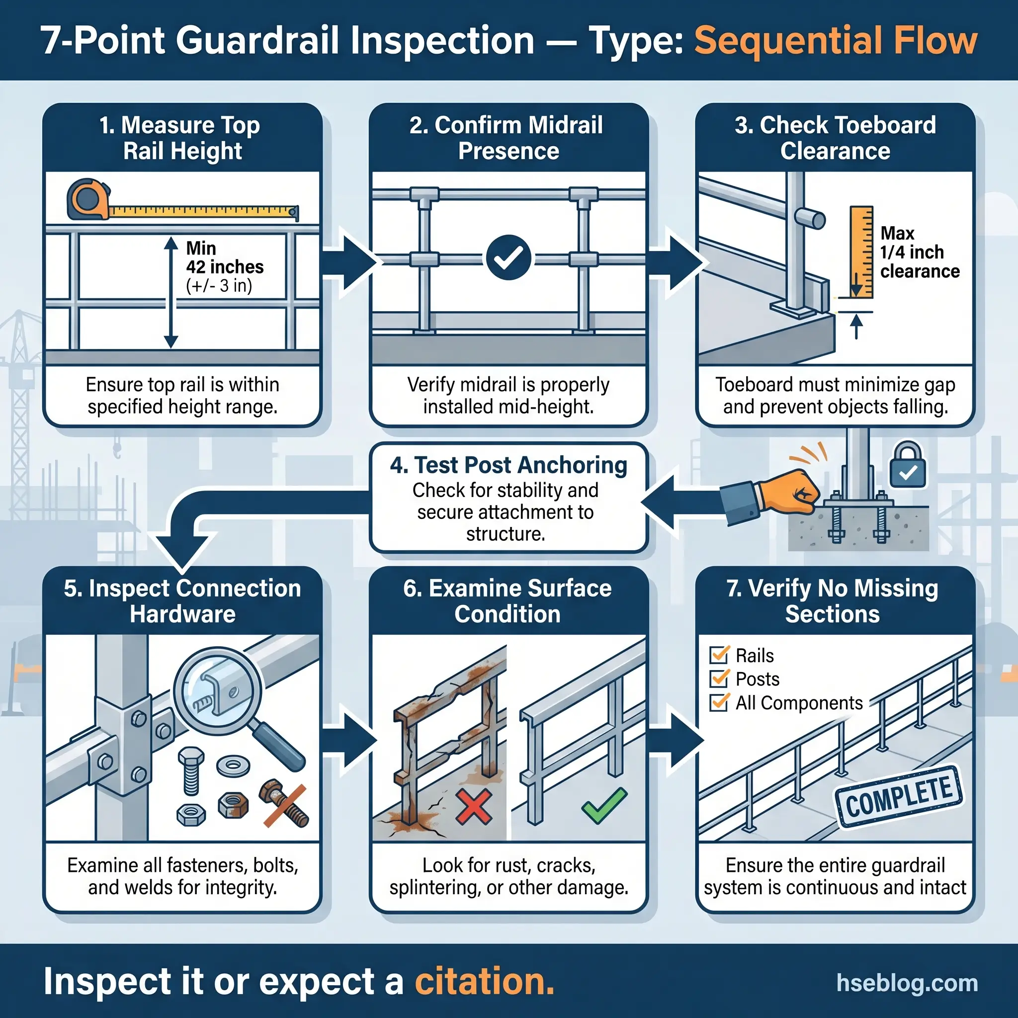 Installing a compliant guardrail system is not a one-time event. Guardrails degrade, get struck by equipment, suffer connection loosening from vibration, and get modified by crews who need access through the barrier. A guardrail that was compliant on Monday can be non-compliant by Wednesday if no one inspects it.