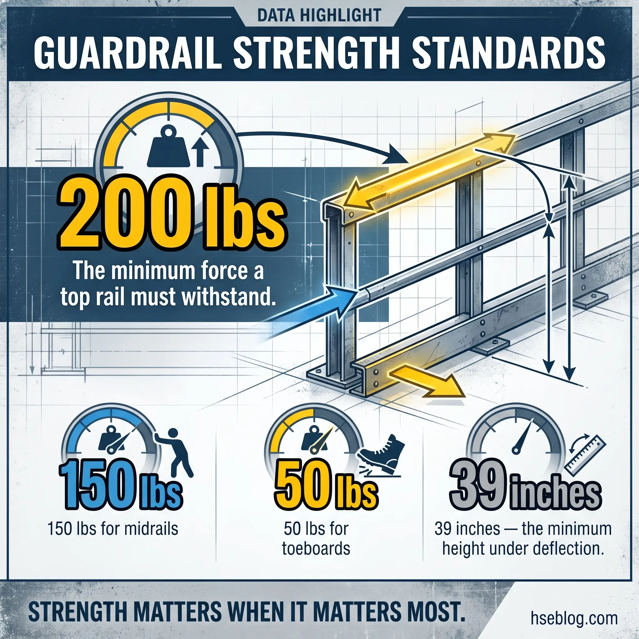 OSHA specifies minimum force resistance and maximum deflection for each guardrail component. These are performance-based requirements — OSHA does not prescribe specific materials, cross-sections, or connection types, but the installed system must meet these thresholds regardless of how it is built.