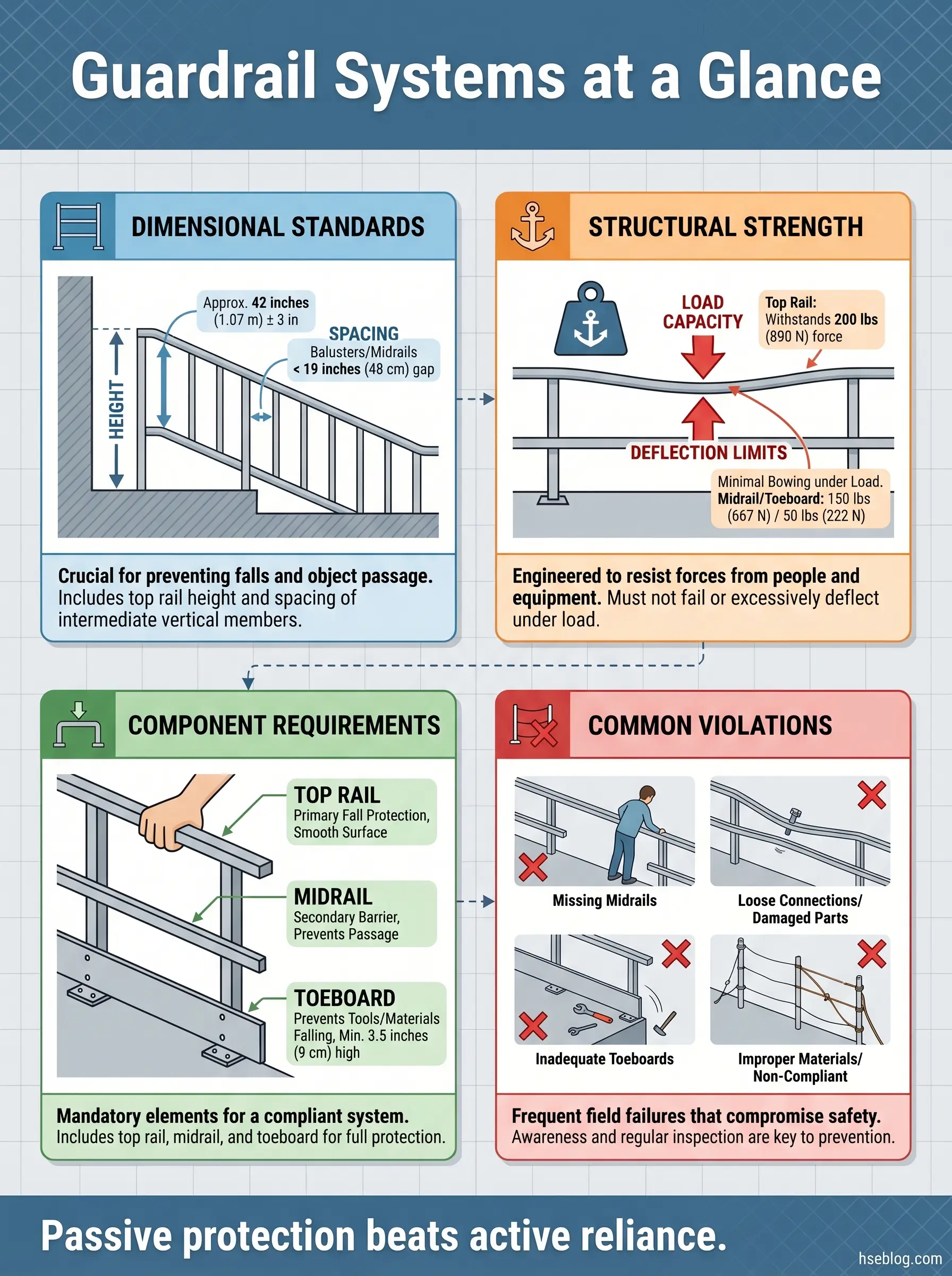 A guardrail system under OSHA’s definition consists of three primary components working together to create a continuous barrier along an unprotected edge. Each component has specific dimensional and performance criteria that must be met simultaneously — partial compliance is non-compliance.