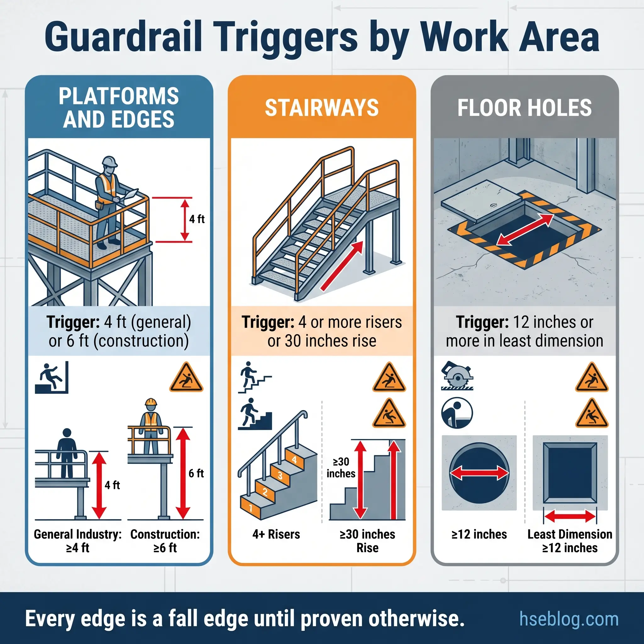 The trigger height difference is the most operationally significant distinction. General industry requires fall protection — including guardrails — at any edge 4 feet or more above a lower level. Construction sets this threshold at 6 feet. That 2-foot gap means a 5-foot drop in a manufacturing facility requires guardrails, while the same 5-foot drop on an active construction site does not technically trigger the OSHA guardrail requirement — though good practice and most company policies mandate protection regardless.