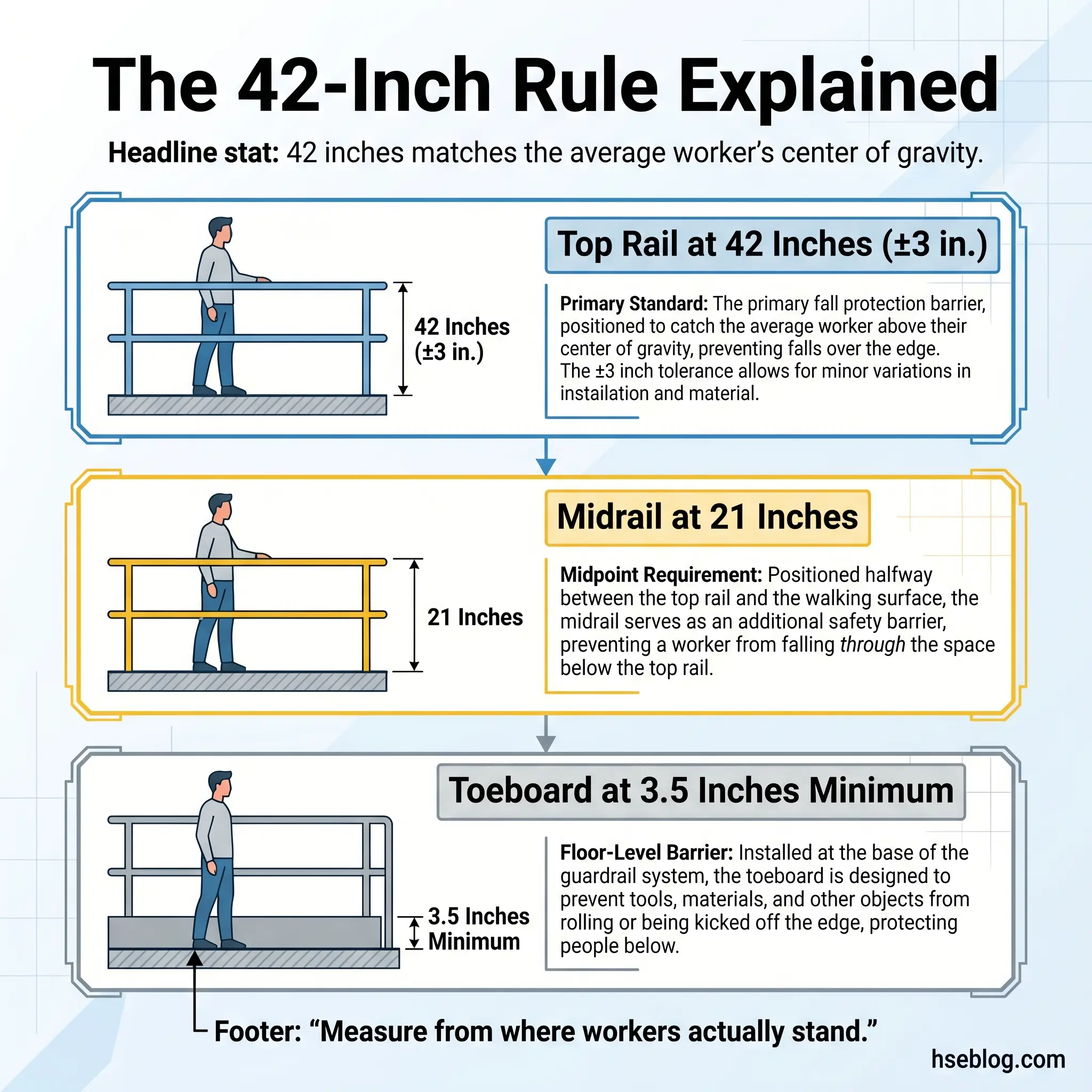 - Top rails must stand 42 inches (±3 inches), with midrails at 21 inches and toeboards at least 3.5 inches tall.
