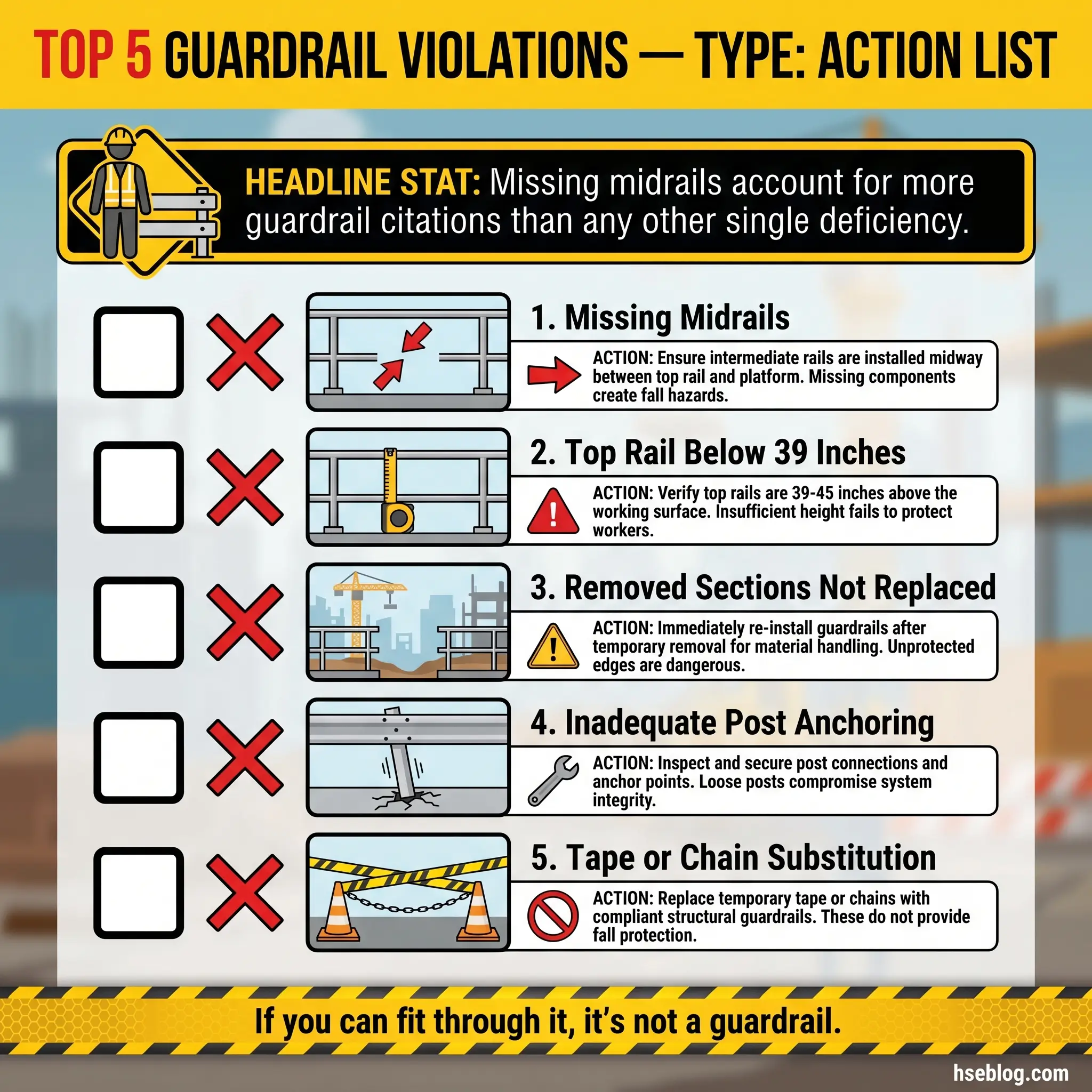 - Missing midrails and loose top rails are the most cited guardrail violations across construction and general industry.