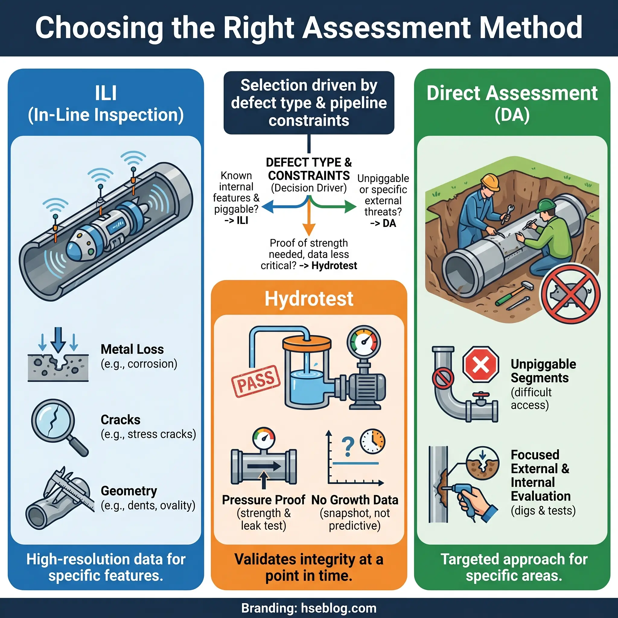 The three assessment options any operator weighs are in-line inspection, hydrostatic pressure testing, and direct assessment. Each finds a different class of defect, and each leaves blind spots.