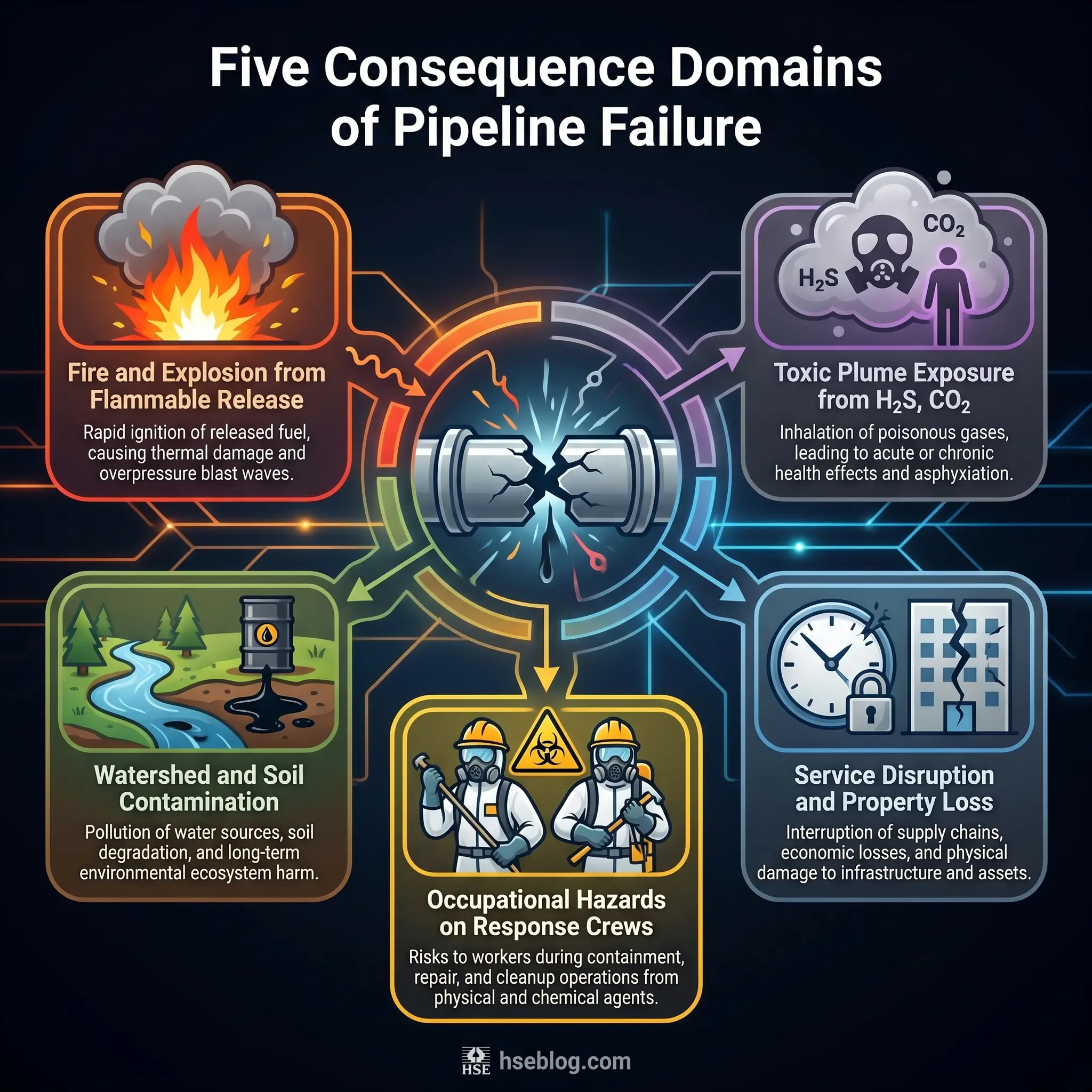 From the community’s perspective, a pipeline is a hazard only at the moment it fails. That frame — consequence before cause — shapes how regulators and responders think about the system. Five consequence domains cover almost every incident worth studying.