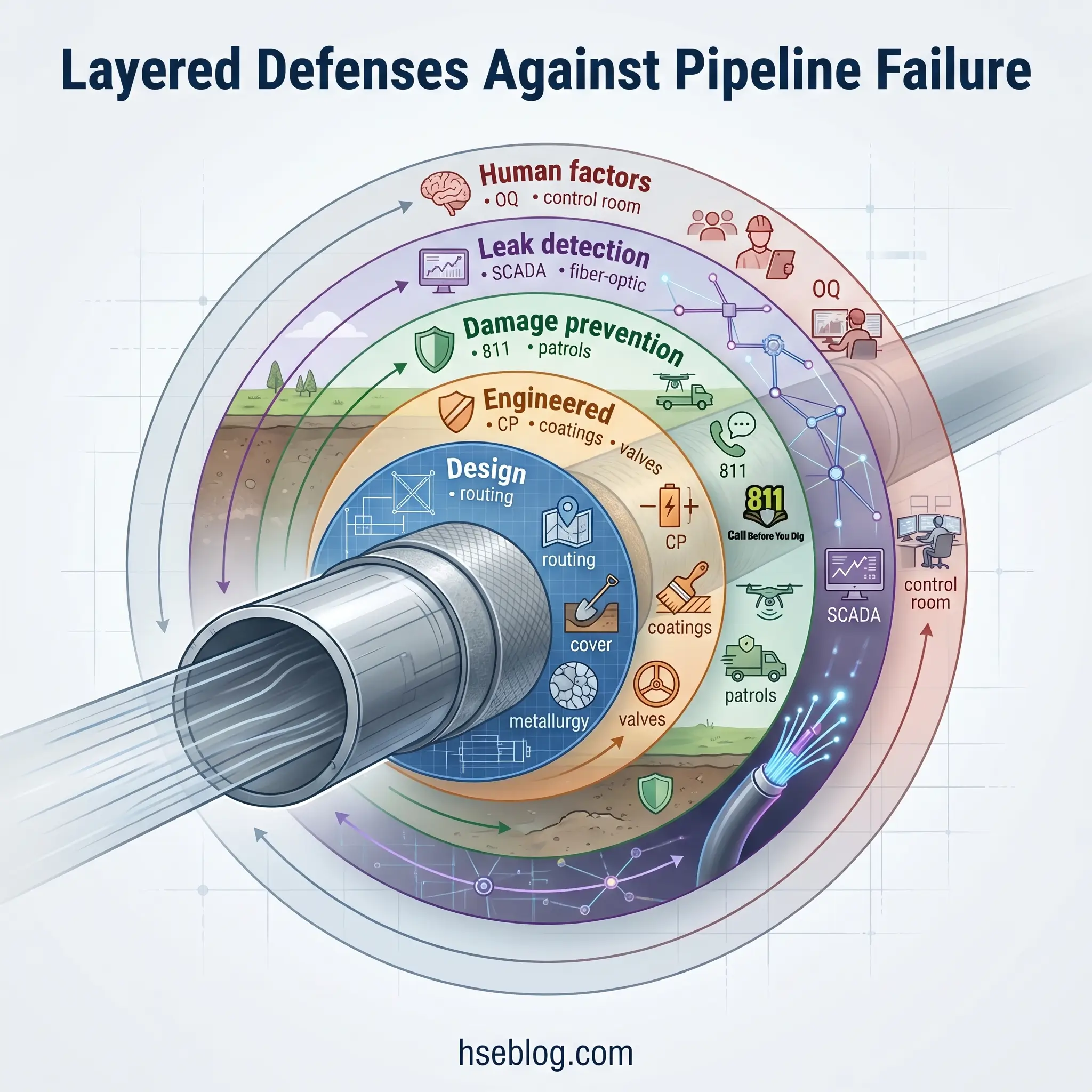 Human factors finish the picture. Operator Qualification requirements under 49 CFR Part 192 Subpart N and Part 195 Subpart G tie documented competency to every covered task. Control-room management rules under §192.631 and §195.446 govern shift handovers, fatigue management, and alarm response. The weakest link in most modern failures is not a tool or a specification — it is a human decision made under pressure.