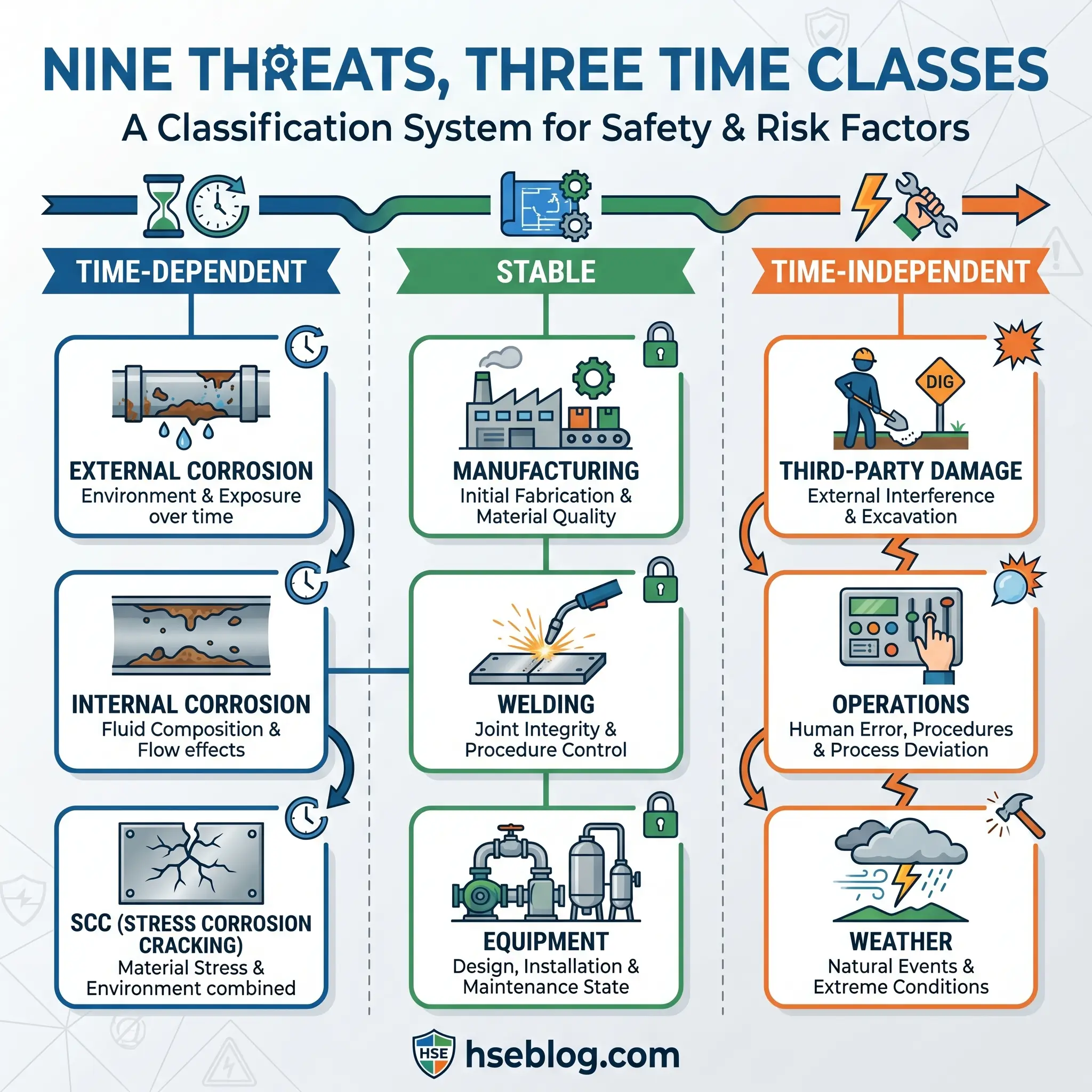 The backbone of modern pipeline integrity management is not a regulation — it is a standard. ASME B31.8S groups twenty-two identified failure causes into nine threat categories and sorts those nine into three time-based classes. PHMSA, API RP 1160, CSA Z662, and most international operators use this same taxonomy, which is why every serious IM data-integration exercise maps back to it. The ASME B31.8S document itself remains the canonical reference for operators designing or benchmarking a program.