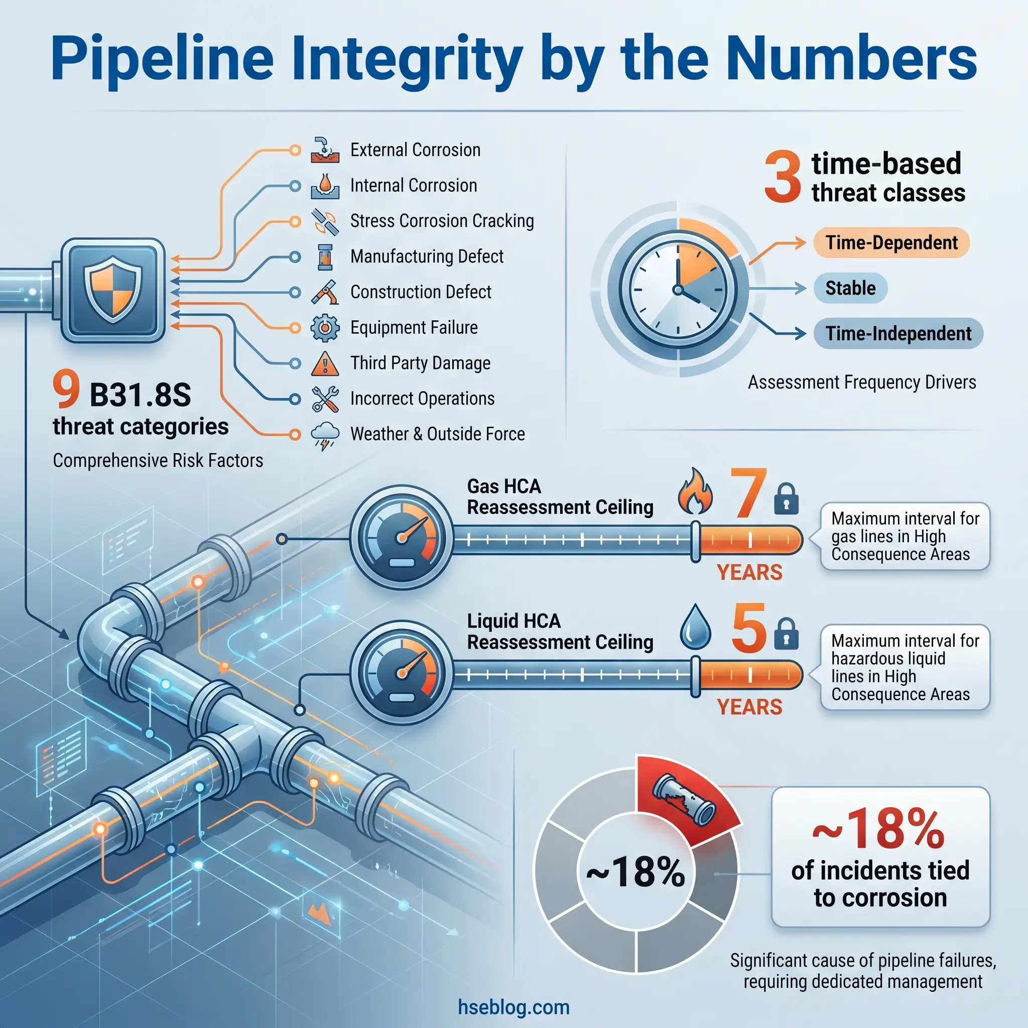 | ASME B31.8S | Gas pipeline integrity | Nine threat categories, data integration, risk assessment |